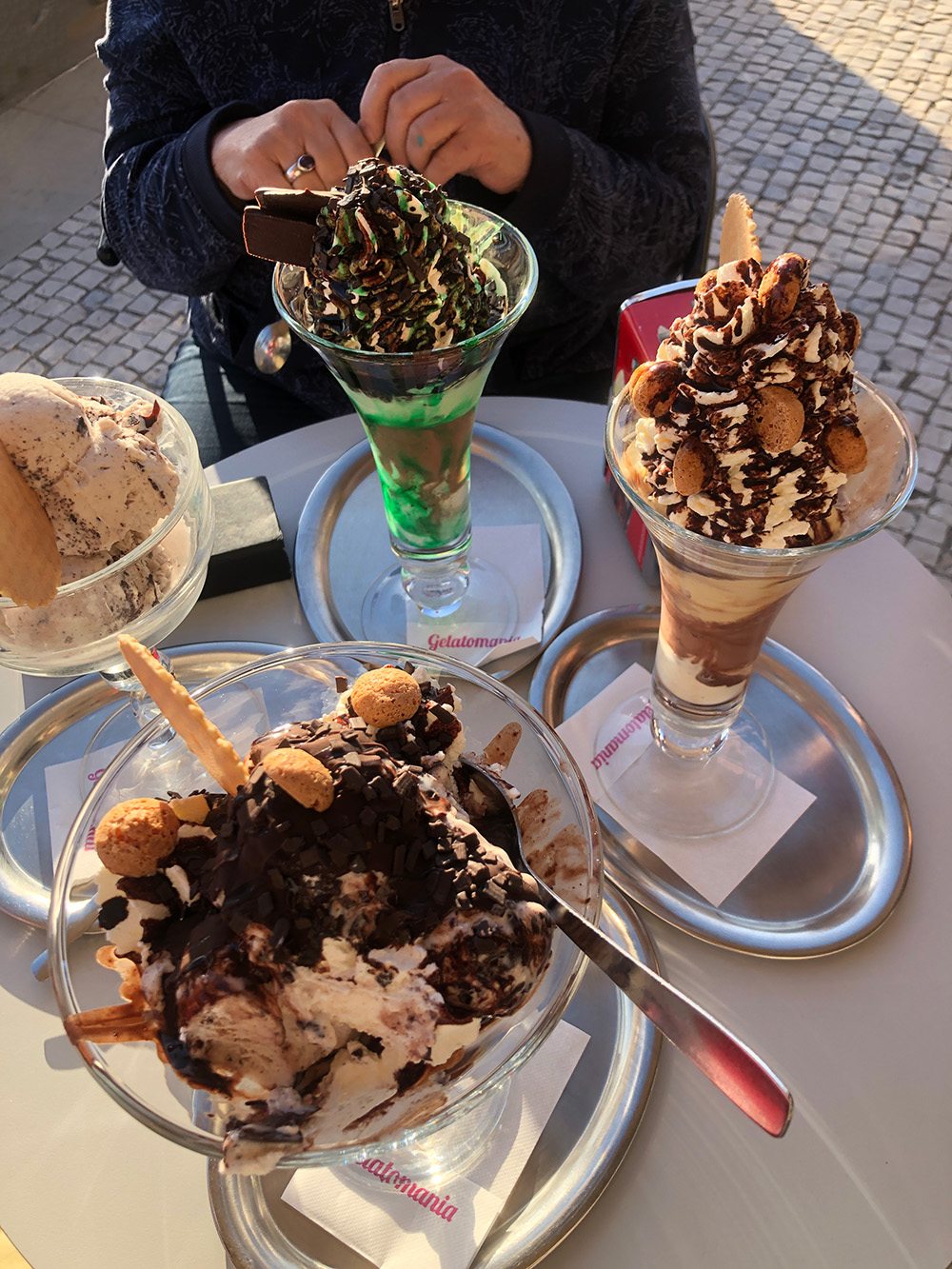 Aan het eind van de dag naar São Martinho do Porto, dat is bijzonder mooi. ’n Lekkere warme dag in Óbidos afsluiten op deze manier is geweldig. Temeer daar er een ijsrestaurant is met ijscoupes die niet onder doen voor een goede maaltijd. Het restaurant heet Gelatomania en het doet zijn naam eer aan. Je kunt er ijshoorntjes krijgen met bolletjes ijs, maar ook fantastische coupes. Een bananasplit komt neer op een kleine fruitmand met ijs , de Stracciatella Especial is ijs met chocola, bitterkoekjes in de vorm van kleine pepernoten in chocoladesaus.