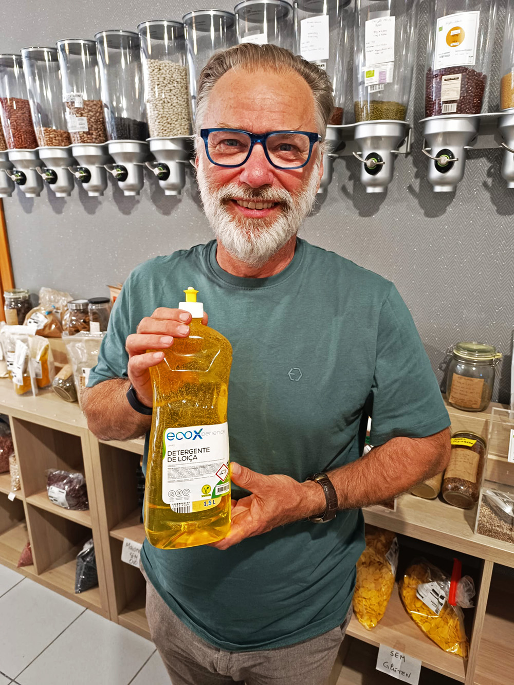 In Benedita is een klein winkeltje, Pé de Feijão heet het. Vermoedelijk is de naam ontleend aan het sprookje van Sjakie en de Bonenstaat, dat in het Portugees João e o Pé de Feijão heet. In het winkeltje kun je alternatieve spullen krijgen, Allerlei soorten meel, maar dan weer geen tarwe. Glutenvrije producten, zeewier, dat soort dingen. En ook verpakkingsvrije spullen, dat is de reden waarom wij daarheen gaan. Zelf een afwasmiddelfles meenemen en die hier laten vullen uit een grote jerrycan. Het winkeltje moet het vooral hebben van reclame op Instagram en andere sociale media en om dat te voeden worden de klanten op de foto gezet en gepubliceerd. Ben je meteen wereldberoemd!