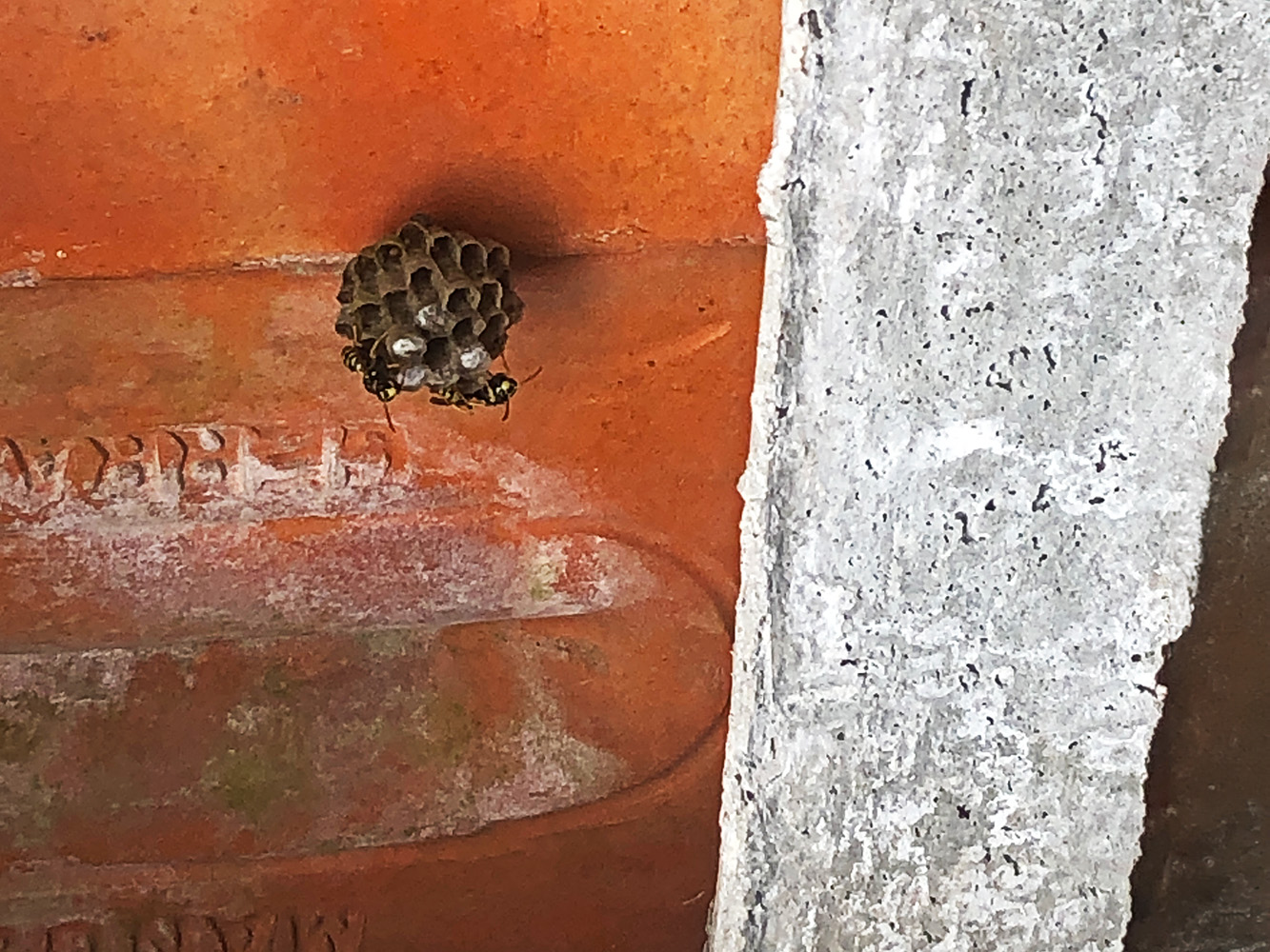 Het is mooi om te zien, maar toch vervelend. In de schuur is begonnen aan een klein nestje. Het zit tegen de pannen aangeplakt, dat wordt wel lekker warm als de zon schijnt. Misschien is dat wel de reden dat het allemaal niet zo snel gaat. Het beginnetje is alweer een paar dagen oud. We zien twee wespen die aan het werk zijn en er zijn zo’n vier kamertjes gemaakt waar waarschijnlijk de larven in zitten of komen te zitten.