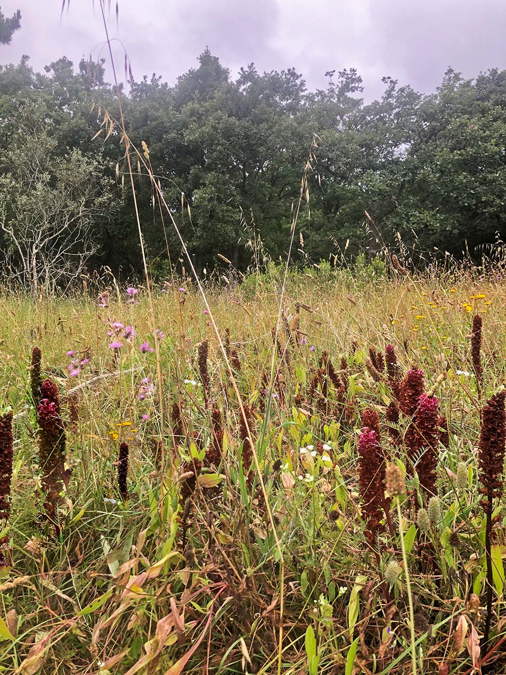 Op 23 april schreven we al van een plantje dat we niet eerder hadden gezien, de Orobanche. Het veld waar de geiten vaak grazen staat er nu vol mee. In het bos onder de bomen zie je ze niet ze staan alleen in het open veld. Het is een rare bloeiwijze. Je ziet de bloem, een soort kaars, maar die gaat niet echt open. Omdat de plant een parasiet is heeft het geen eigen bladen. De hele fotosynthese wordt gedaan door de gastheer en de plant zelf geniet er alleen maar van. Welke plant nou precies de gastheer is weten we niet, de Orobanche staat gewoon op de grond lijkt het, hij parasiteert kennelijk op de wortels van andere planten. En dat moeten dan wel veldplanten zijn die ook niet in het bos voorkomen.
