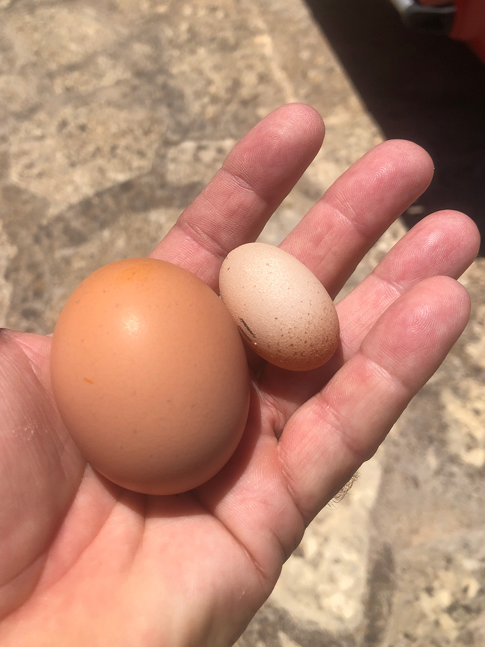 De ene dag vinden we het grootste ei ooit, zie gisteren, en een dag later vinden we het kleinste ei. Het grotere ei op de foto heeft normale afmetingen, het kleine ernaast heeft de maat van een chocolade paasei. ’t Kan zomaar de eerste leg zijn van een van de nieuwelingen, maar het kan ook zo maar de laatste leg zijn van een van de oudere kippen. Het is een schattig klein eitje. Voor een mini-omelet of zo.