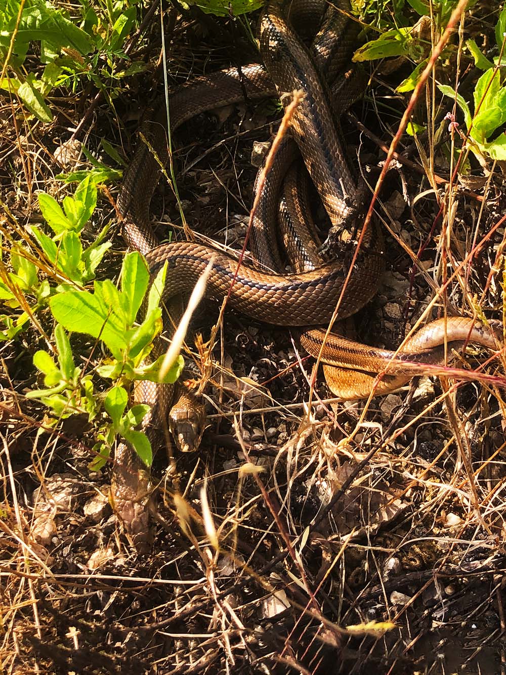 Er zitten natuurlijk overal slangen, soms vinden we de huid als een dier verveld is, maar levende slangen zie je niet zo veel. Ze kunnen zich kennelijk goed schuil houden, des te mooier als je er twee tegelijkertijd ziet.