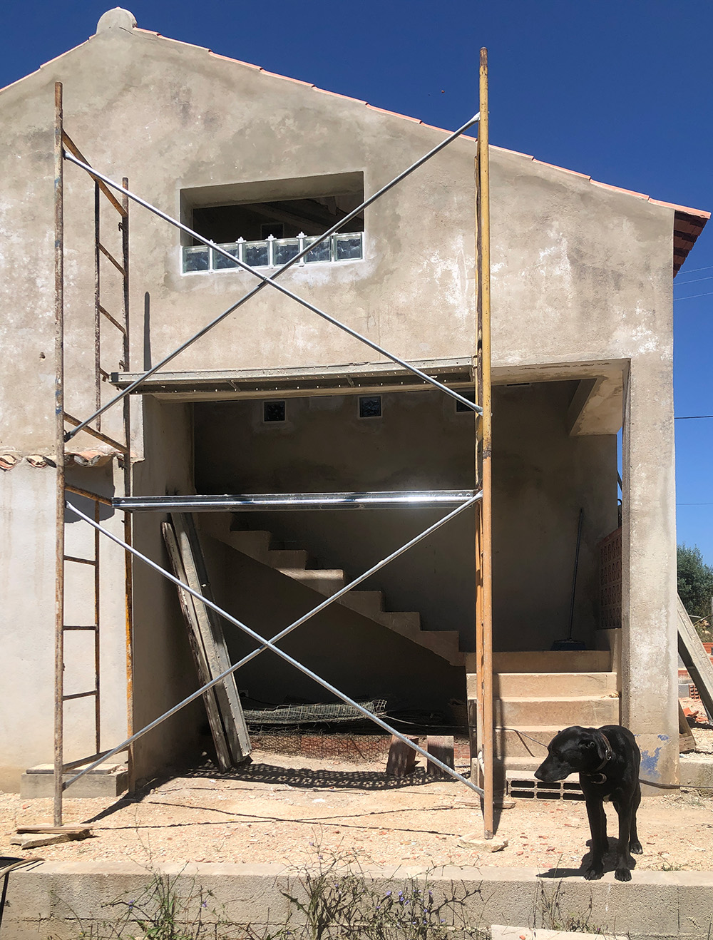 Omdat we binnen een muurtje hebben laten plaatsen wordt het wat donker boven. We hebben dan wel glasblokken in de muur laten plaatsen maar het is wel een binnenmuur. De oplossing is een nieuw gat in de blinde muur waarin dan weer glasblokken komen. Miryam, één van onze buren uit Casal da Marinha, kende niet de term ‘blinde muur’, in het Engels bestaat dat kennelijk niet, althans niet in die term. Zij vroeg zich af een muur met één raam dan een cycloop heette. Geinig.