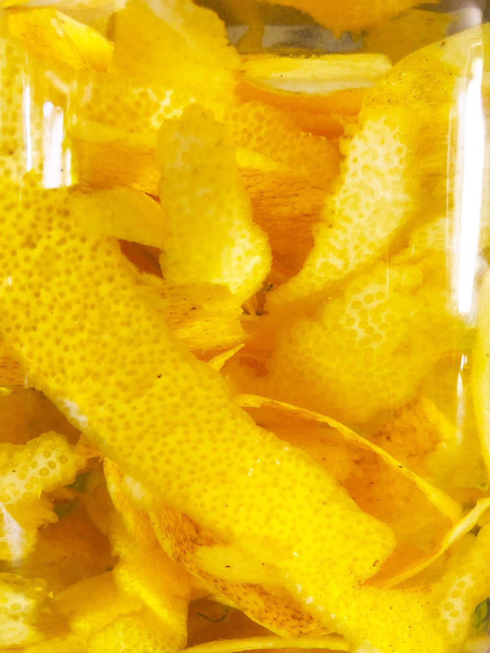 De citroenen worden dun geschild en ze gaan dan in een grote pot die we gevuld hebben met wodka.