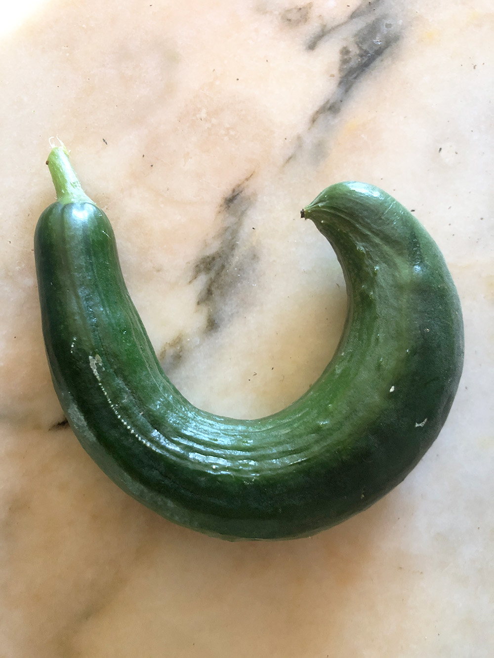 Je moet blij zijn met wat je krijgt! De hele oogst aan komkommers ligt hier op het aanrecht. Zegge en schrijve één hele komkommer. En nog krom ook. De woordspeling ligt voor de hand.