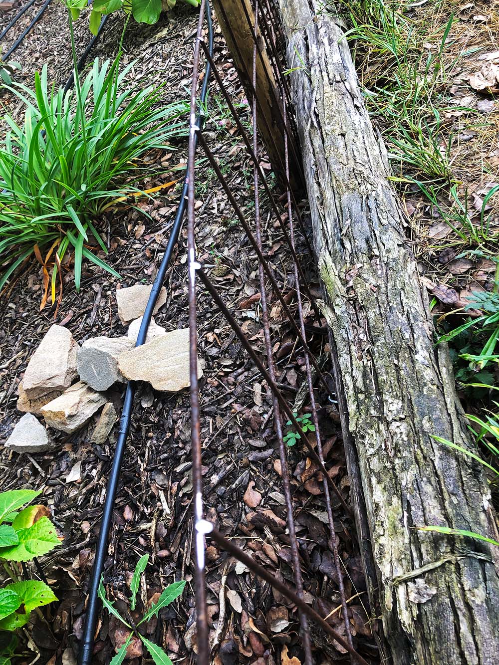 Op het terrein aan de voorkant, waar de honden overdag spelen (en slapen!) hebben we wat perkjes gemaakt. Van het betonijzer dat we over hebben van het maken van het hek hebben we een soort van klein hekje gemaakt en dat vastgemaakt aan paaltjes die in de grond geslagen zijn. Het is zo;n dertig, veertig centimeter hoog. Eigenlijk heeft het een symbolische waarde, het geeft aan dat de honden niet aan de andere kant van het hekje mogen komen. Ze kunnen er makkelijk overheen, maar dat doen ze niet. Tenminste niet als we er bij zijn.