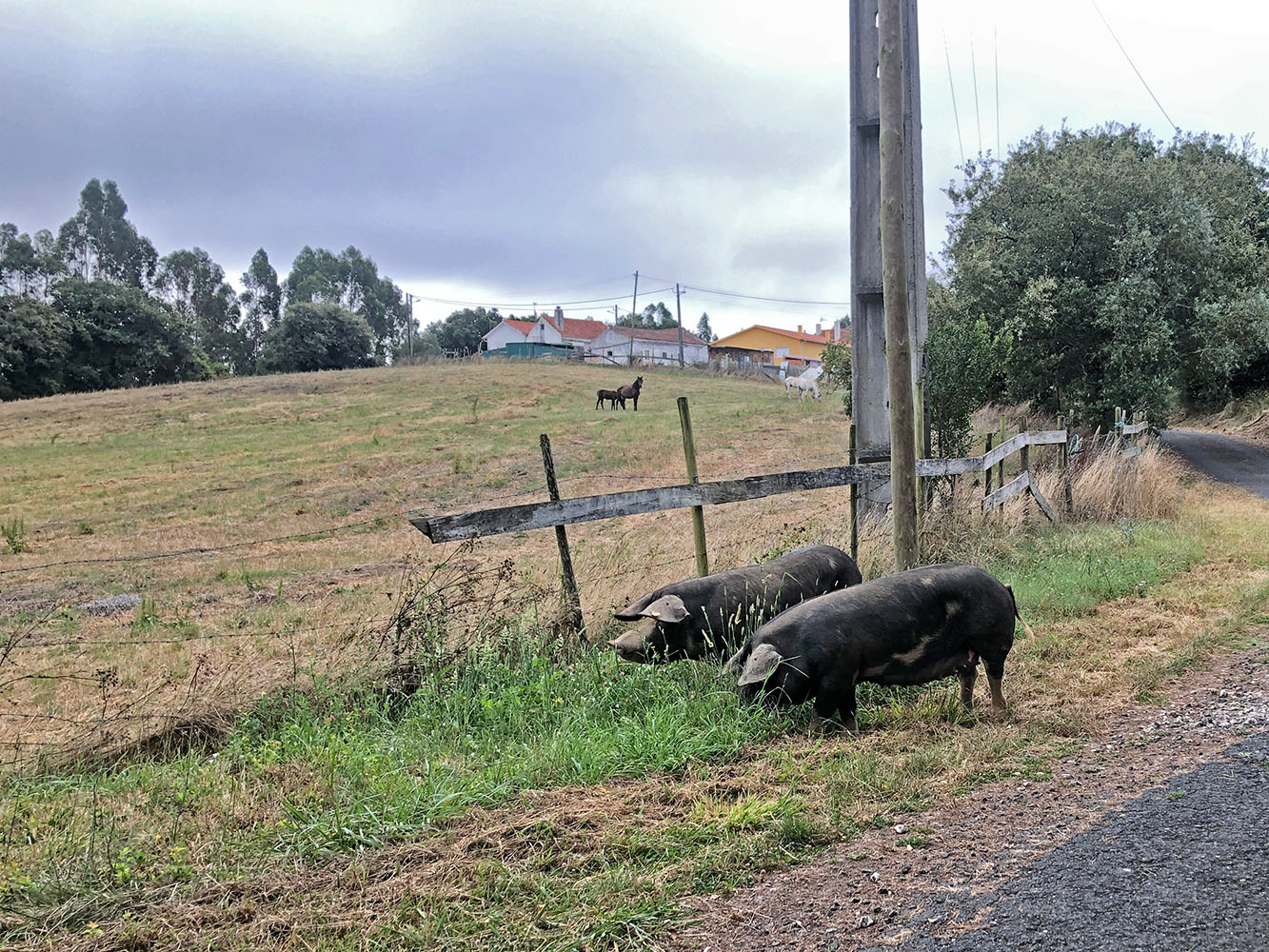 Het is alweer een tijdje geleden, zeker een week of vier, vijf, maar het is weer raak. Of mis, het is maar hoe je het bekijkt. De varkens van de varkensfokkerij een stukje verder naar beneden langs het weggetje hebben weer een uitgang gevonden of gemaakt. Ze komen gezellig door het bos wandelen, snuffelen hier en daar en gaan aan de kant van de weg lopen grazen. Ze kijken nauwelijks op als je dichterbij komt en ze kunnen trouwens ook niet zo veel zien, want de oren hangen over hun ogen. Het deert ze niet, ze wandelen rustig verder. De honden gaan als een wilde tekeer als ze de varkens in het oog krijgen, maar ook daar trekken ze zich niets van aan. Als je dichterbij komt wandelen ze voor de zekerheid wel weg, maar zolang je geen plotselinge bewegingen maakt, blijven ze rustig en gaan ze doodgemoedereerd hun gang.