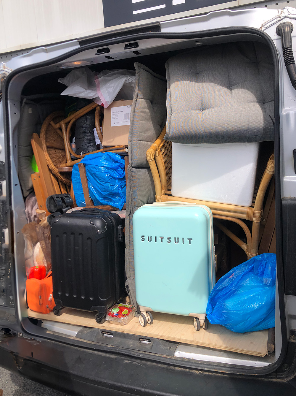 Met een enigszins halfvolle bus zijn we drie weken geleden naar Nederland gegaan en nu met een volle bus weer terug. Stoelen en dozen van vrienden van ons die hun huis in Nederland leeg aan het halen zijn om in de loop van volgend jaar definitief naar Portugal te verhuizen. Stoelen, een kastje  en klein spul voor Betty. Die stoelen zijn wel handig want die komen met kussens en dat konden we weer goed gebruiken om de boel een beetje klem te zetten. Zelf hadden we ook een stuk of wat dozen met allerlei spul dat we in de Raafstraat niet meer nodig hebben.