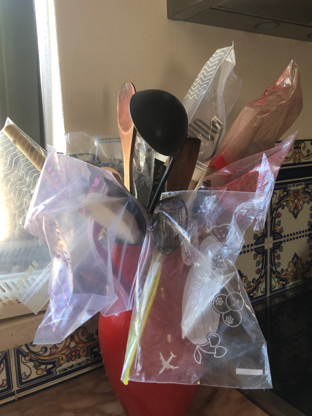Als we van sommige soort fruit niet te veel in één keer hebben dan maken we het schoon en stoppen het in de vriezer. Als we dan genoeg verzameld hebben wordt het verwerkt tot jam, als het om aardbeien of physalis gaat. Of we bewaren het om bijvoorbeeld soep van te maken als het om tomaten gaat. In de vriezer wordt het bewaard in plastic zakjes, die je dicht kunt zippen. Die kunnen natuurlijk makkelijk meerdere keren meegaan, maar dan moeten ze wel gewassen worden. Wassen is goed om te doen, maar afdrogen is wat lastiger. Je kunt ze ook gewoon laten uitdruppen op de pollepels en ander keukengerei. Zo ontstaat een prachtige zakjesboom, die bijna las decoratie kan dienen.