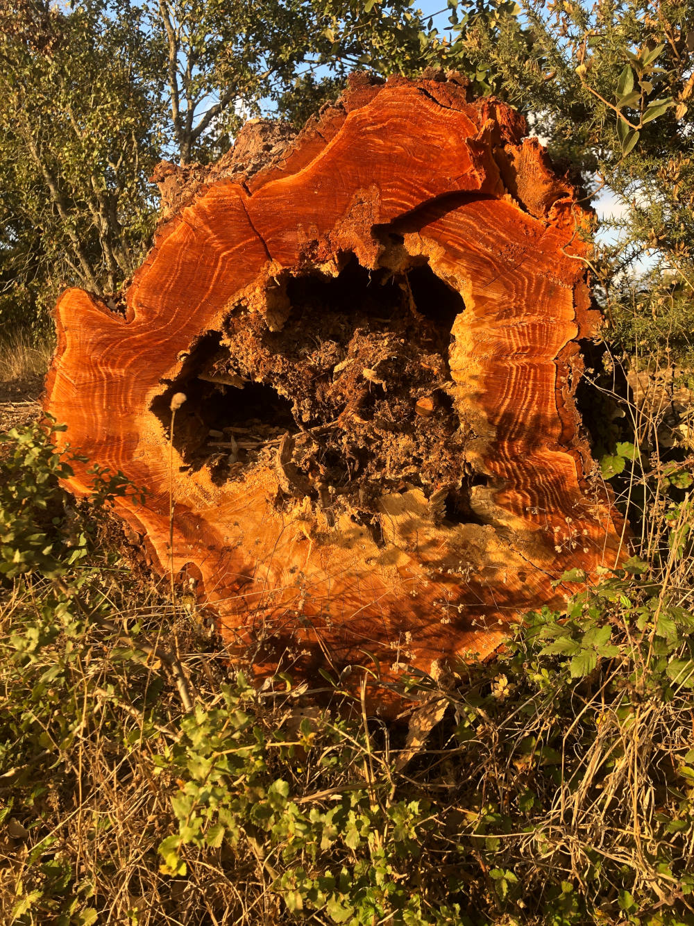 Er worden niet alleen eucalyptusbomen gerooid. Ook eiken moeten eraan geloven, waarschijnlijk als ze ziek zijn of een gevaar worden wegens mogelijk omvallen. Zo ook deze eik, aan de ringen te zien enkele tientallen jaren oud. (Ja Evert, hij ligt er nog!). De boom is helemaal uitgehold en zal wel ernstig ziek zijn geweest. In het late zonlicht geeft hij nog wel een mooi plaatje.