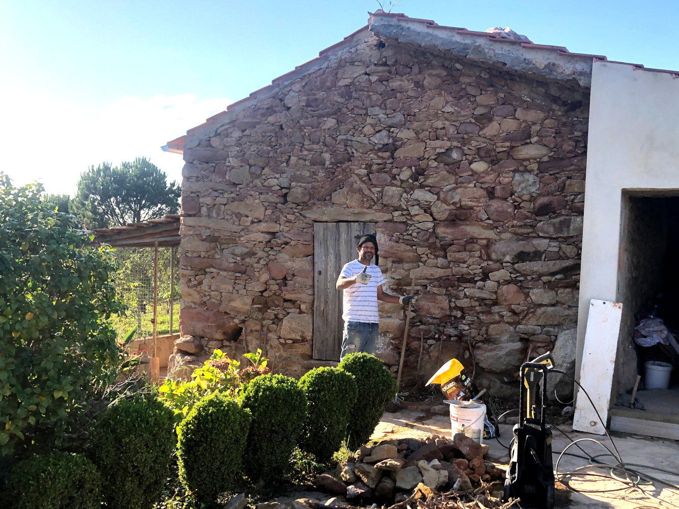 Met gisteren erbij heeft hij de voorgevel van het Oude Huis schoongebikt. Alle voegen met klei en oud cement leeggehaald. ’t Ziet er bijzonder anders uit. Kijk voor de grap naar de foto van een paar dagen geleden, toen we net de begroeiing eraf hadden gehaald.