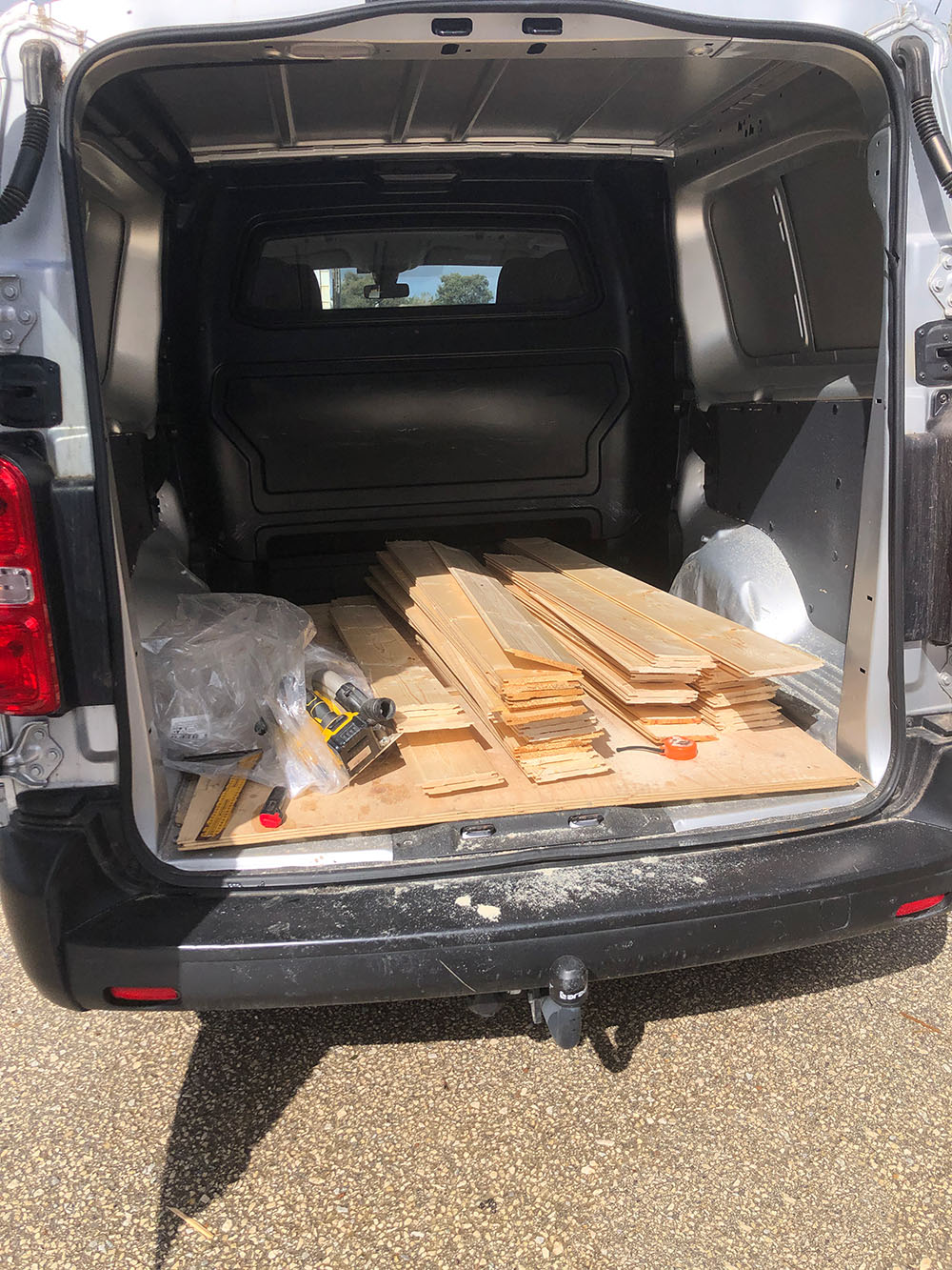 Als we die planken kopen zijn ze bijna vier en een halve meter lang, dat gaat natuurlijk nooit in de bus. Daarom cirkelzaag, winkelhaak, rolmaat enzovoorts meegenomen om de boel ter plaatse op maat te zagen. Grappig was wel dat we net voor lunchtijd kwamen en de boel moest dicht. Met de lange planken in de bus en een medewerker erachter om de planken van de grond te houden werd de bus naar buiten gereden. ’t Moet een grappig gezicht geweest zijn.
