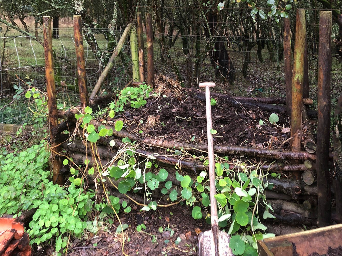 Twee jaar geleden hebben we met Matthew deze composthoop gemaakt. Lekker volgegooid met van alles uit de tuin en stro na de verschoning van de stal. Het staat nu zo’n neen maanden stil toen we met Kees een nieuwe hebben gemaakt. Nu kan hij weer leeg gemaakt worden. Dat doen we door scheppen van de composthoop te zeven op centimetergaas, alles wat achterblijft gaat op de volgende hoop en wat erdoorheen komt is mooie zwarte aarde. Ideaal voor op de moestuin. We zijn op de helft van het leeghalen, en het heeft al gauw vijftien zakken zwarte grond opgeleverd.