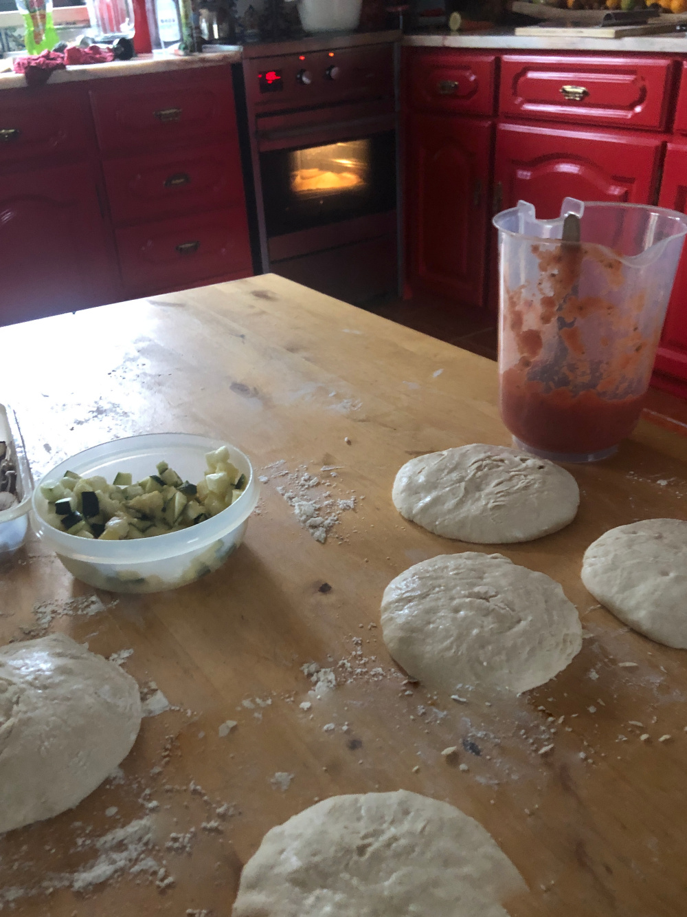 Wat kun je doen op een regenachtige dag, behalve schoonmaken. Pizza bakken natuurlijk. Van Henri, één van onze vrijwilligers, hebben we een mooi pizzarecept gehad. Zelf hadden we al een langzaamrijzend deeg in de koelkast staan, dat gebruikten we als uitgangspunt. Het recept hebben we niet meer gevonden, dan maar een beetje uit het hoofd.