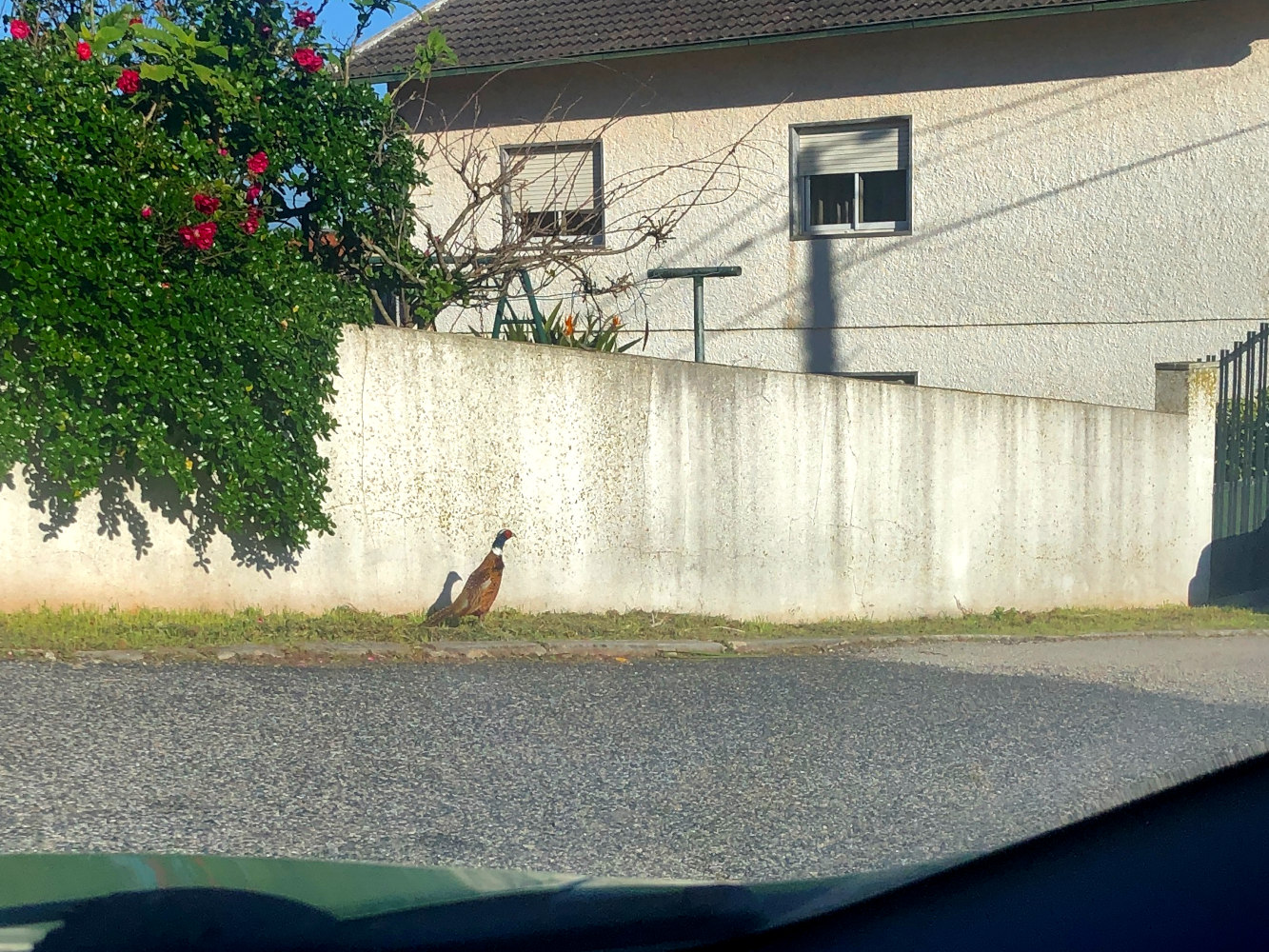 Je weet dat ze er zijn, maar je ziet ze bijna nooit. Des te verrassender is het dat er zo maar een fazant loopt midden in Benedita. En hij blijft nog redelijk zitten ook. Eerst liep hij zo’n beetje op het kruispunt en toen hij de auto aan zag komen of aan hoorde komen liep hij een stukje verder en bleef parmantig in het zonnetje zitten. Helemaal alleen, geen soortgenoten in de buurt, tenminste niet zichtbaar.