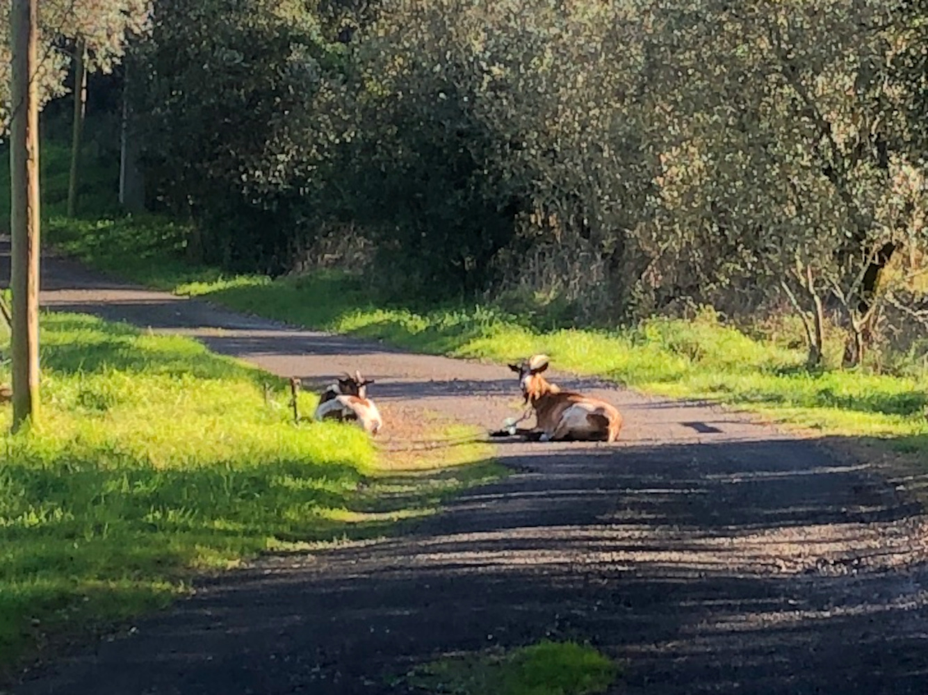 Het is hard werken voor de geiten, al dat gras en onkruid dat verwerkt moet worden. Af en toe is het tijd om te relaxen. Ze zijn wel slim, die geiten, ze gaan lekker midden op de weg liggen. Door de zon wordt het asfalt een beetje warm en dan werkt het als een soort knuffelmuur, maar dan als knuffelweg. Gelukkig houden ze niet zo van auto’s, als er eentje in aantocht is, staan ze snel op en zoeken een veilig heenkomen een stukje van de weg af. Ze werken zo ook een beetje als verkeersdrempel, want de snelle jongens die zo af en toe lanskomen, houden voor de zekerheid toch maar in.