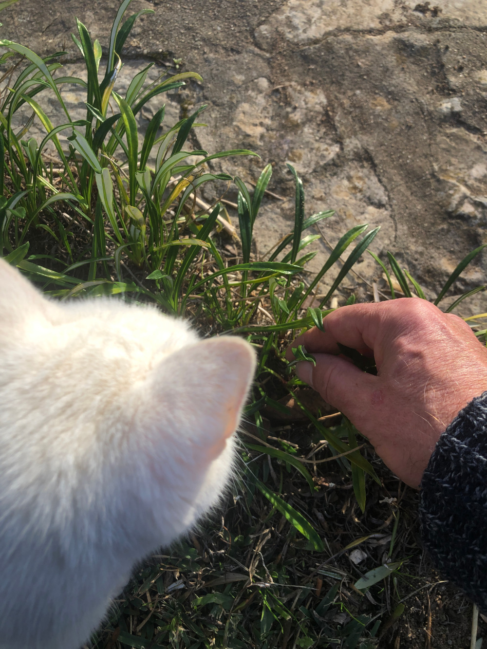 Op het terrein valt altijd wel ergens onkruid te wieden. Langs het gras staan gazania’s, als er veel zon is bloeien ze uitbundig, nu is het even wat minder, doordat de dagen kort zijn en er dus veel minder zonuren zijn. Tussen de gazania’s gaan wel weer andere planten groeien, die we daar weer niet willen hebben. Wieden dus. Gelukkig hoef je dat niet alleen te doen, want zodra je aan het wieden slaat komt er direct hulp. Soms zijn het de kippen die meteen op de werkzaamheden afkomen, maar nu die overdag in de kraal zitten is hun plaats overgenomen door de katten. Die komen bij toerbeurt even neuzen of er misschien niet iets te halen is. Wel lastig af en toe, doordat ze precies in het beeld zitten, maar het is wel weer gezellig.