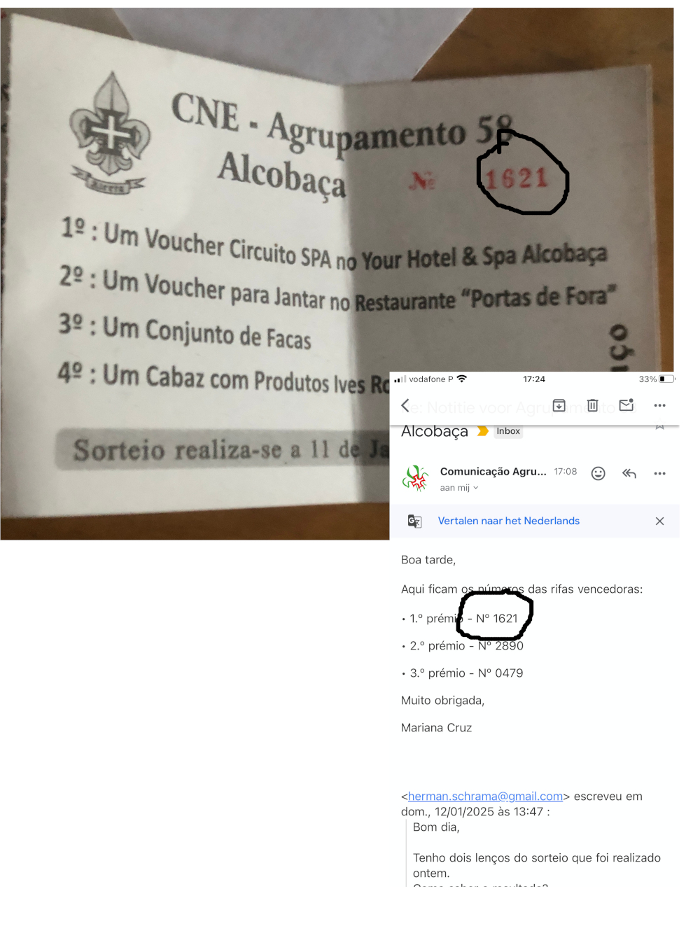 Dat is ook wat. Zit je rustig op een terrasje in Alcobaça, ’t was al in november, komt er een meisje van de locale scouting langs om loten te verkopen. Ach, je steunt er de scouting mee, dus waarom niet. Wel twee loten gekocht en de loten opgeborgen. Vandaag toevallig in de portemonnee gekeken en de loten weer ontdekt. Blijkt de trekking gisteren geweest te zijn. Waar dan de uitslag te vinden? Gelukkig heeft de scouting een facebookaccount (CNE staat voor Corpo Nacional de Escutas) én ze hebben een e-mailadres. ’t Is dan wel zondag, maar toch even een mailtje gestuurd met de vraag hoe je achter de uitslag kunt komen. Bijna per kerende post een mailtje terug met de winnende nummers. Blijken we de hoofdprijs te hebben!
