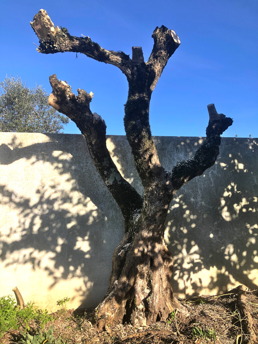 Af en toe moet het er eens rigoureus van komen, het snoeien van de olijfboom. We halen er wel eens een paar takken af, maar soms is het goed dat eens drastisch te doen. Deze boom is waarschijnlijk al meer dan twee honderd jaar oud. We kennen het verhaal van de oude dame van rond de negentig die toen ze als klein meisje bij haar grootouders logeerde, opa en oma betrapte op het elkaar zoenen achter deze boom. Toen was het dus al een volwassen boom. Het is lastig schatten hoe oud hij nou eigenlijk is, maar een hoge leeftijd heeft hij zeker.