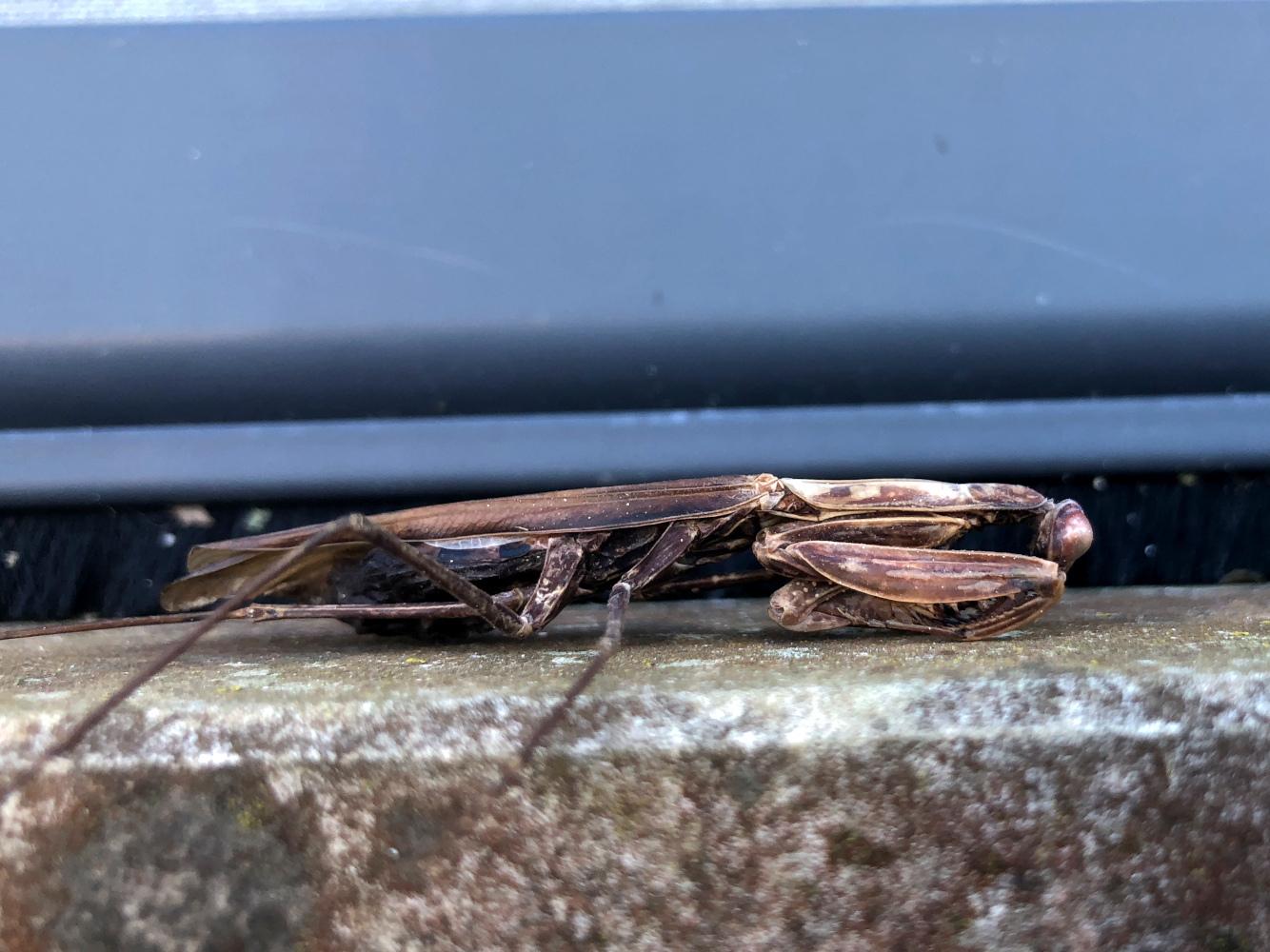 Je vraagt je af hoe hij daar komt. De bidsprinkhaan zit een beetje dood te zijn, buiten op de vensterbank. Hij zit er waarschijnlijk al een tijdje maar door zijn schutkleuren valt hij niet zo op. In het langlopen zie je hem dan ineens zitten. Volkomen uitgedroogd, dus niet van gisteren of eergisteren, maar hij zit er wel nog steeds parmantig, alsof hij in zijn rustpauze overvallen is door wat dan ook.