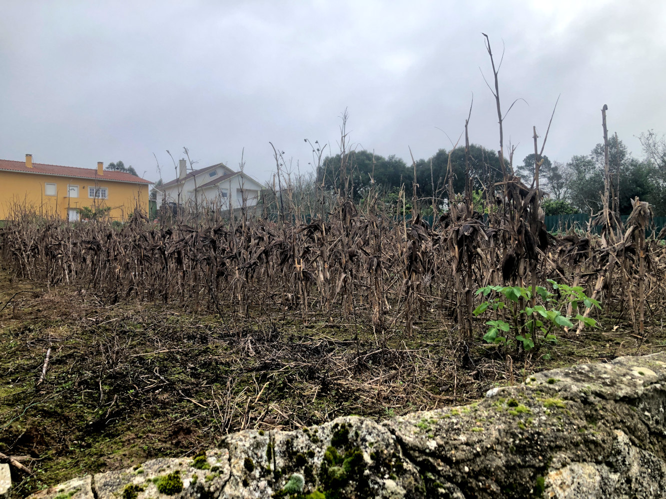 ’t Was ooit een mooi maisveld, dat van de buren langs het weggetje. De mais is allang geoogst, maar de planten staan er nog altijd, hartstikke dood. De maiskolven hebben een tijdje op de grond gelegen voordat ze geraapt werden en nu staat het er al een tijdje zo bij. Kennelijk is er nog geen behoefte aan iets anders planten, wat een beetje troosteloos gezicht is. Zeker als het een beetje miezerig weer is, dan is de neiging tot melancholie meteen een stuk groter.
