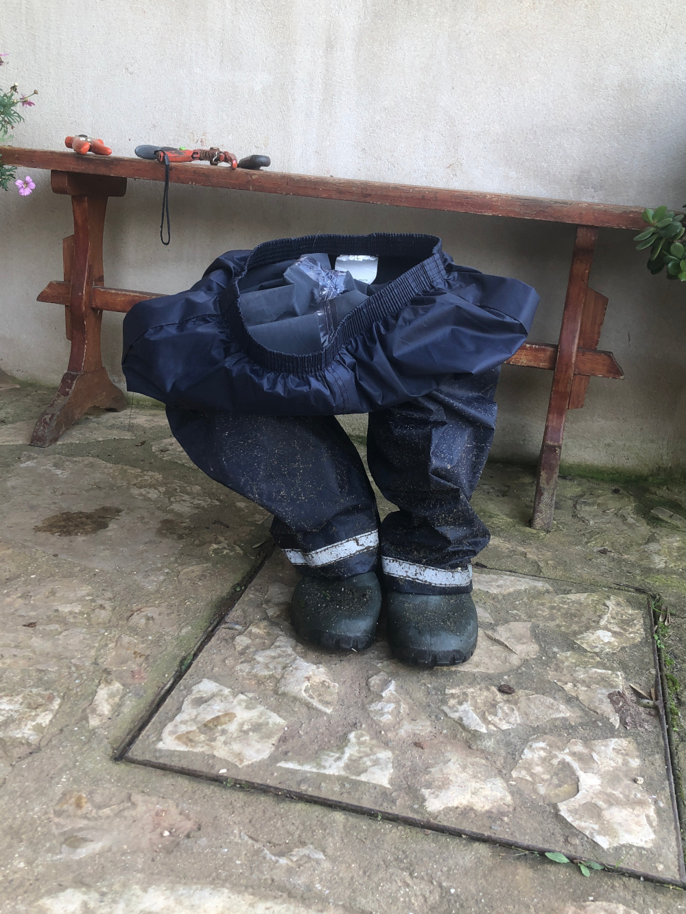 Nee, geen flauwe grappen maken over korte benen en zo/ Het regenpak staat uit te rusten op de laarzen. Met de hogedrukspuit zijn de tegels van het pad naar het appartement schoon gemaakt. Als het zoveel regent dan ontstaat er een algenlaagje dat af en toe best glibberig kan zijn. En het pad naar het appartement loopt ook nog eens een beetje af, wat glijden nog waarschijnlijker maakt. De hogedrukspuit doet fantastisch werk maar het water mét het vuil erin spat natuurlijk alle kanten op. Een regenpak en regenlaarzen zijn dan een geweldige uitkomst. Pad schoon, regenpak vies, maar wat maakt dat uit.