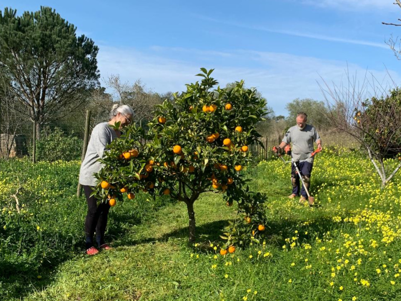 We zetten onszelf niet zo vaak op de foto, maar vandaag waren we lekker samen bezig en Betty kwam langs, die maakte deze foto en vond het de moeite waard om in de verhaaltjes van onze dagelijkse beslommeringen en overpeinzingen op te nemen. Herman is aan het maaien en Amanda is mandarijnen aan het plukken (Mineola!).