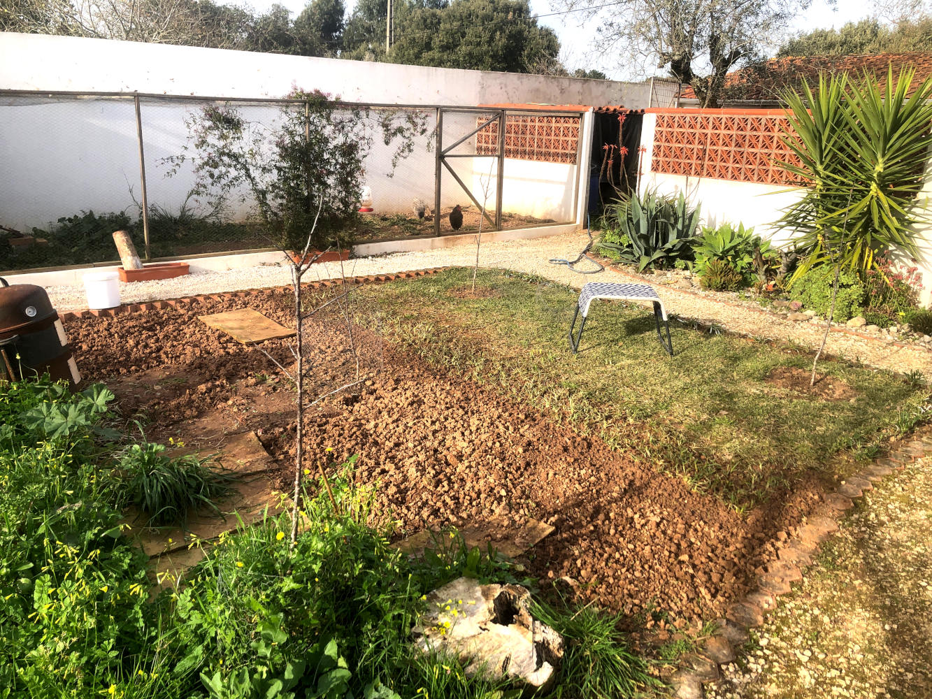 Elke keer als we gras over hebben, hetzij van de kanten die we rechtsteken, hetzij van Betty, die bij haar hetzelfde doet, werken we weer een stukje aan het grasveld. Doordat het de afgelopen weken veel geregend heeft staat het weer even stil, maar nu weer dagelijks een flinke portie zon hebben gaan we weer vrolijk verder. Het gaat in vier fasen. De eerste fase is de onbewerkte grond. Ruim een jaar geleden hebben onze Braziliaanse vrienden de boel lekker opgeschoond, maar als je het laat gaan staat het zo weer vol. Voornamelijk met klaverzuring, dat neemt de boel nogal over.