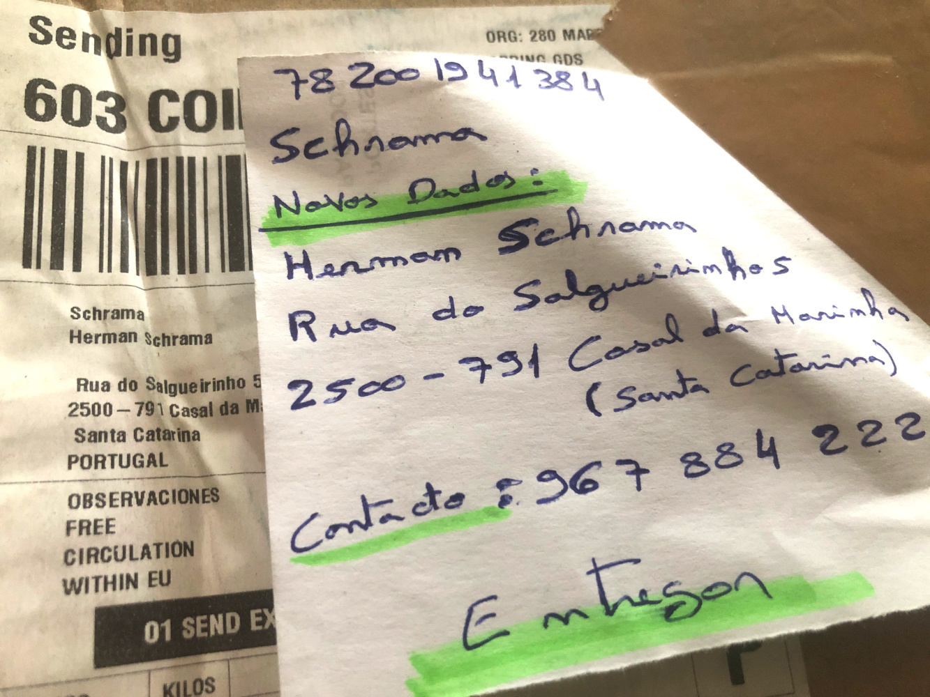 Op het pakket zat een los briefje geplakt met daarop de mededeling Novos Dados, nieuwe gegevens.