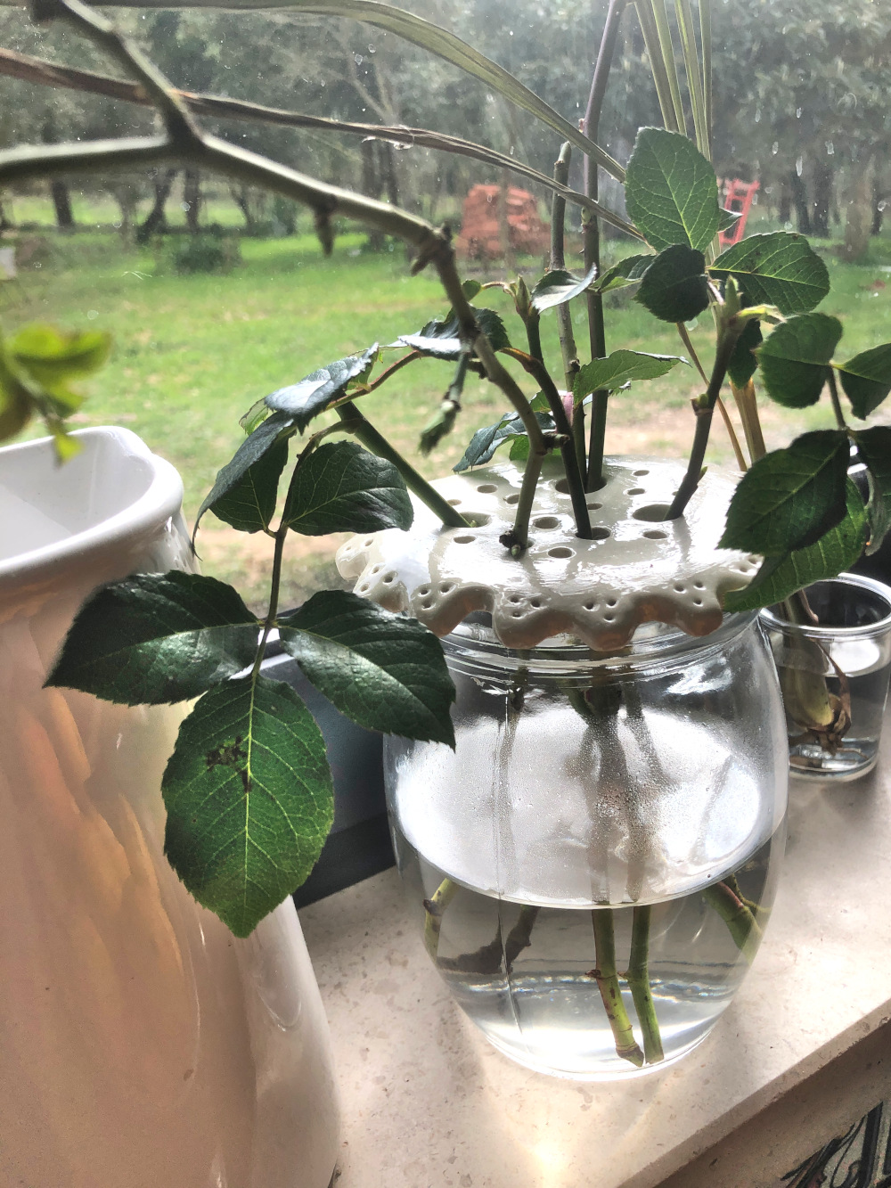 Amanda doet een keramiekcursus. Jawel, hier in Santa Catarina. Ze maakt bordjes en een eierhouder en ook deze rozenstandaard. Het is niet speciaal voor rozen bedoeld, het zorgt ervoor dat bloemen of stekjes in een ruime pot toch een beetje rechtop staan. De stekjes komen van een roos die in een grote pot stond, maar die door de vele regen een beetje stond te watertrappelen. We hebben hem daarom in de vollegrond gepoot, vlak bij het Oude Huis. De takken die eraf gesnoeid moesten worden gaan we proberen te stekken.