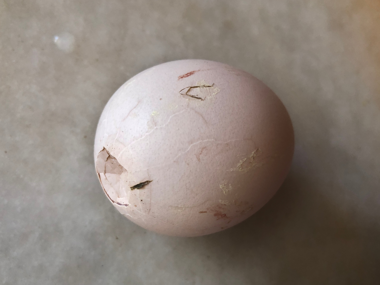 Het ei heeft een deukje, alsof het al een keer gevallen is en er zit wat bloed aan. We gaan er maar vanuit dat het de eerste bevalling was en dat na een jaar.