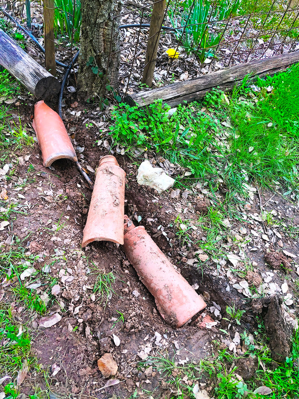 Een tijdje geleden al, in Juli met Victoria en Jordan, hebben we de slangen voor de bewatering aangelegd. Gedeeltelijk zijn dat druppelslangen en gedeeltelijk gewone. De gewone slangen zijn bedoeld om de ene sectie te verbinden met de andere. Die lopen dus op een gedeelte waar ook de honden lopen en wijzelf natuurlijk. Om te voorkomen dat bij een graafactie de slangen beschadigen hebben we er toen dakpannen opgelegd waar we de ‘vleugels’ van afgehaald hebben. Zo krijg je een mooie tunnel waar de slang goed in past. Het geheel gaat dan in een gootje zodat het mooi met aarde bedekt kan worden en je er na een tijdje niets meer van ziet.