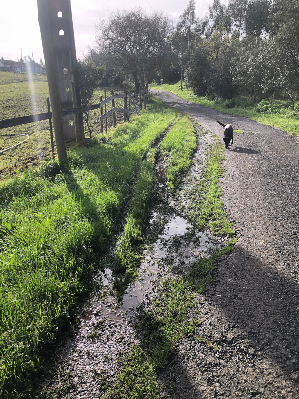 De paarden zijn weer weg en dat laat zijn sporen na. De trailer waarin de paarden vervoerd worden komt in het de berm te staan en die is nu zo zacht van het vele water dat erop gevallen is en wat van het weggetje naar beneden is gekomen dat de wielen bijna tot hun assen erin zakken. Het is nog een wonder dat de pick-up die de trailer trekt niet vastgelopen is.