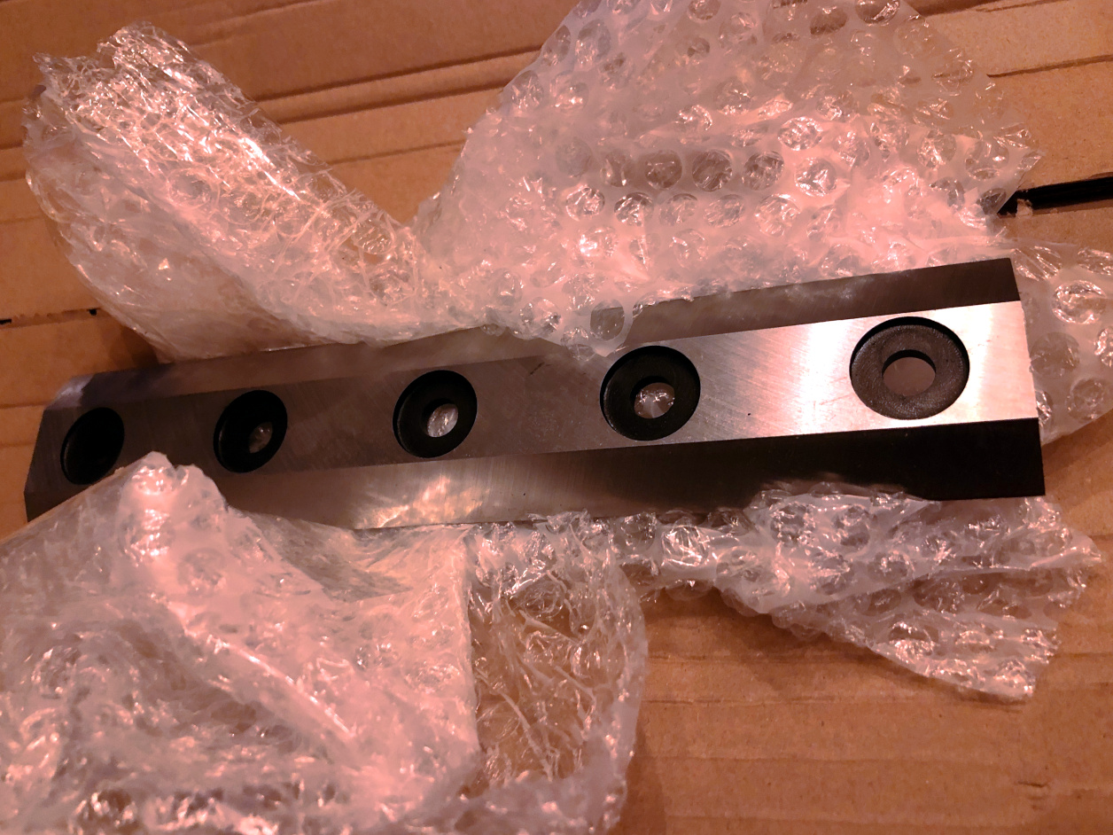 Hector, de houtversnipperaar, is gemaakt om, de naam zegt het al, hout te versnipperen en geen metalen voorwerpen. We denken dat in het verleden, ergens vorige zomer, één van onze vrijwilligers een beetje onzorgvuldig is geweest met het controleren van het hout dat er doorheen gaat. Er heeft waarschijnlijk een spijker, een schroef of een boutje in één van de stukken hout gezeten. De messen zijn daarom flink beschadigd. Op zich niet zo erg, hij doet het nog best, maar vooral dunne takjes gaan er ongesneden doorheen. Het betekent dat de voorraad houtsnippers vergeven is van dunnen takjes van een centimeter of twintig. Niet wat we willen. Voor het bedekken van de bodem van het kippenhok is dat niet zo erg, maar voor het bedekken van bloembedden of paadjes is het wat irritant. Nieuwe messen dus!