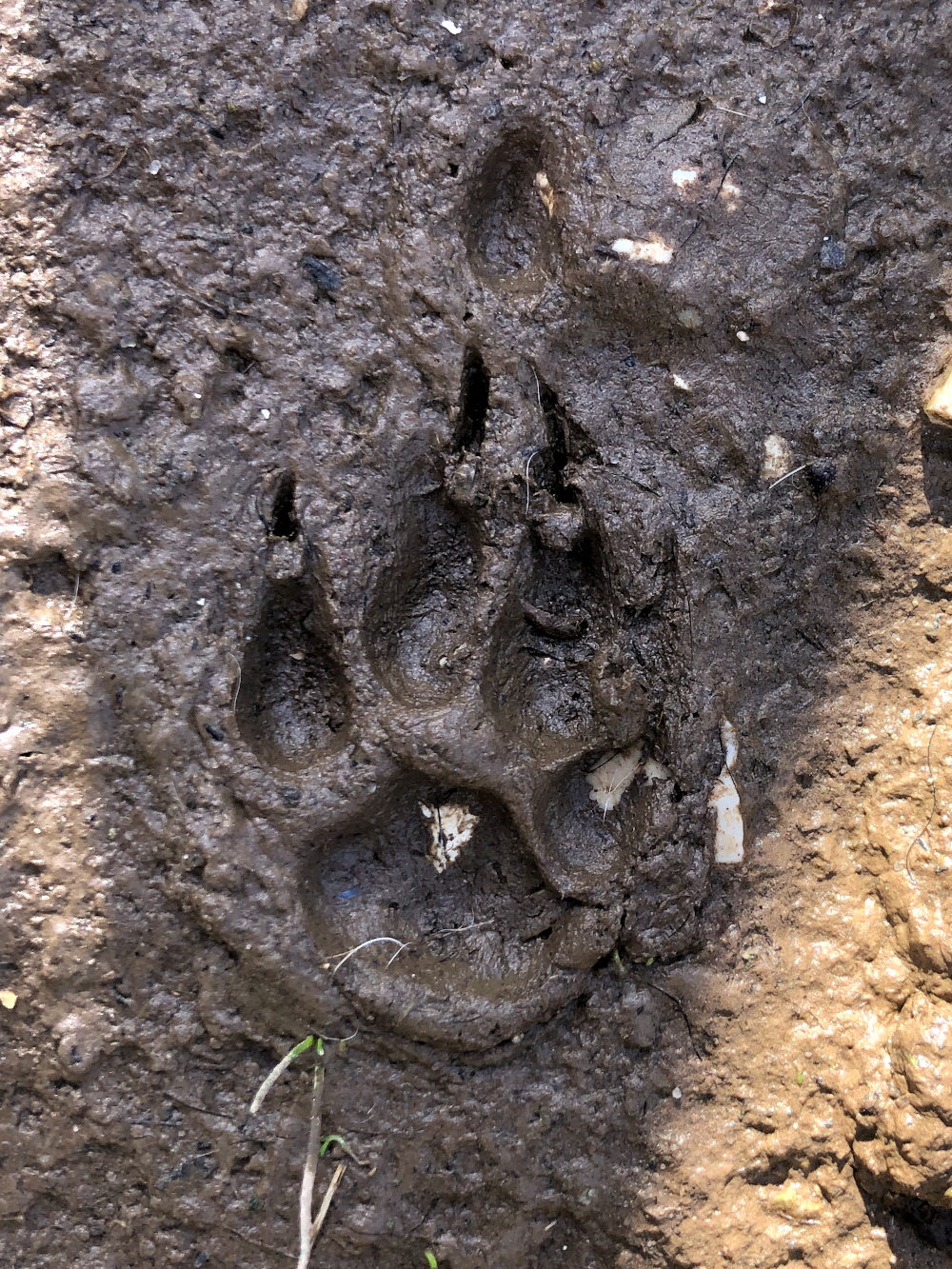 Nu het een hele dag zomaar niet geregend heeft, wordt de modder een beetje steviger. ’t Mooie is dat je dan pootafdrukken erg goed kan zien. Vlak voor het hek ontstaat een enorme waterplas als het regent, maar nu een dag later, is het goede modder voor afdrukken. Je ziet overduidelijk de grote hondenpoten van Karma, maar ook de wat kleinere van Tómas en Milan. Ook zie je mooie kattenpootjes. Er is er ook één die we niet meteen thuis kunnen brengen, in de war gebracht door de nagelafdrukken die je kunt zien. Google Lens gaat helemaal los, die heeft het over konijnen wolven, marters en ga maar door. Zou het een kattenpootafdruk zijn van een kat die uitgleed en zijn nagels gebruikte? Is het een ander dier dat we nog niet kennen?