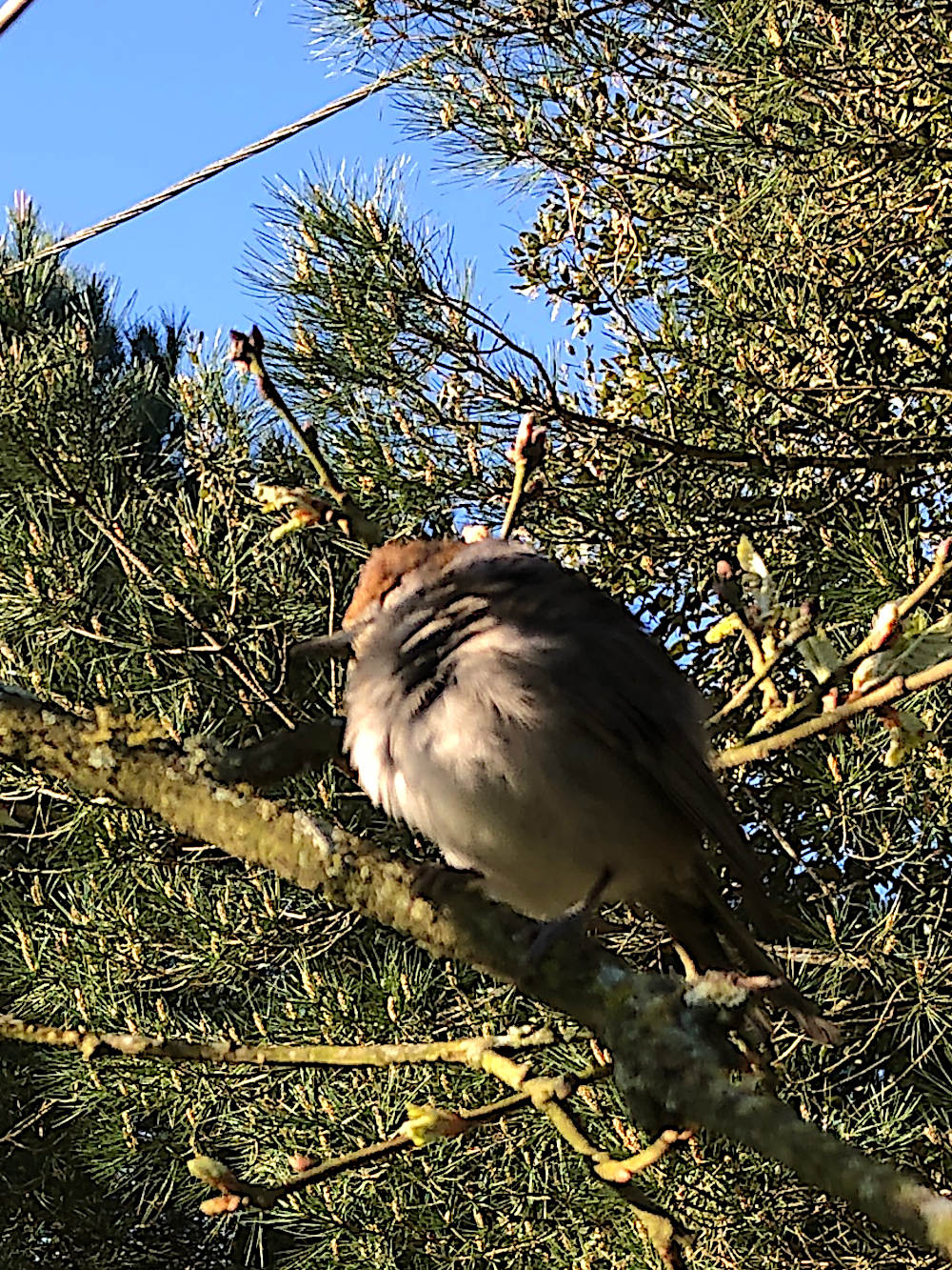 Het is een beetje lastig fotograferen, zo’n jonkie dat in een boom zit. Hij zat eerst aan de kant van de weg, ingedoken, proberen onzichtbaar te zijn. We waren de honden aan het wandelen. gelukkig hield het diertje zich zo stil dat de honden het niet opmerkte. We dachten eerst dat het een dood vogeltje was, gegrepen door de katten, maar het leefde nog. Voorzichtig oppakken ging, het fladderde een beetje. We hebben het toen in de boom gezet en het wipte snel een stuk hoger. Zo slecht was het er ook niet aan toe.