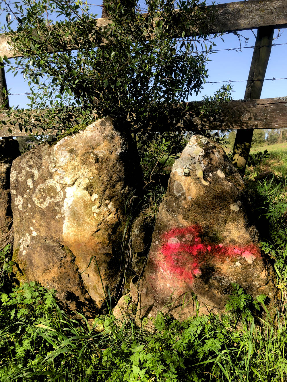 Er is vast weer een feestje binnenkort. Op diverse plekken langs het weggetje staat in ene een roze pijl. In het begin van het weggetje op de houten paal voor de glasvezellijnen, een stukje verder op het straatnaambordje van Rua do Lumião en weer een stukje verder op één van de grote stenen langs het weiland van de paarden. Op de omheining van de varkens zien we ook een roze markering. ’t Zal er wel mee te maken hebben, de hekken rond de paardenwei die zo’n beetje op instorten stonden zijn gerepareerd. Provisorisch natuurlijk, waarom zou je het meteen goed doen. Hoe dan ook, het ziet er een beetje opgeknapt uit. Kennelijk klaar voor een feestje binnenkort.