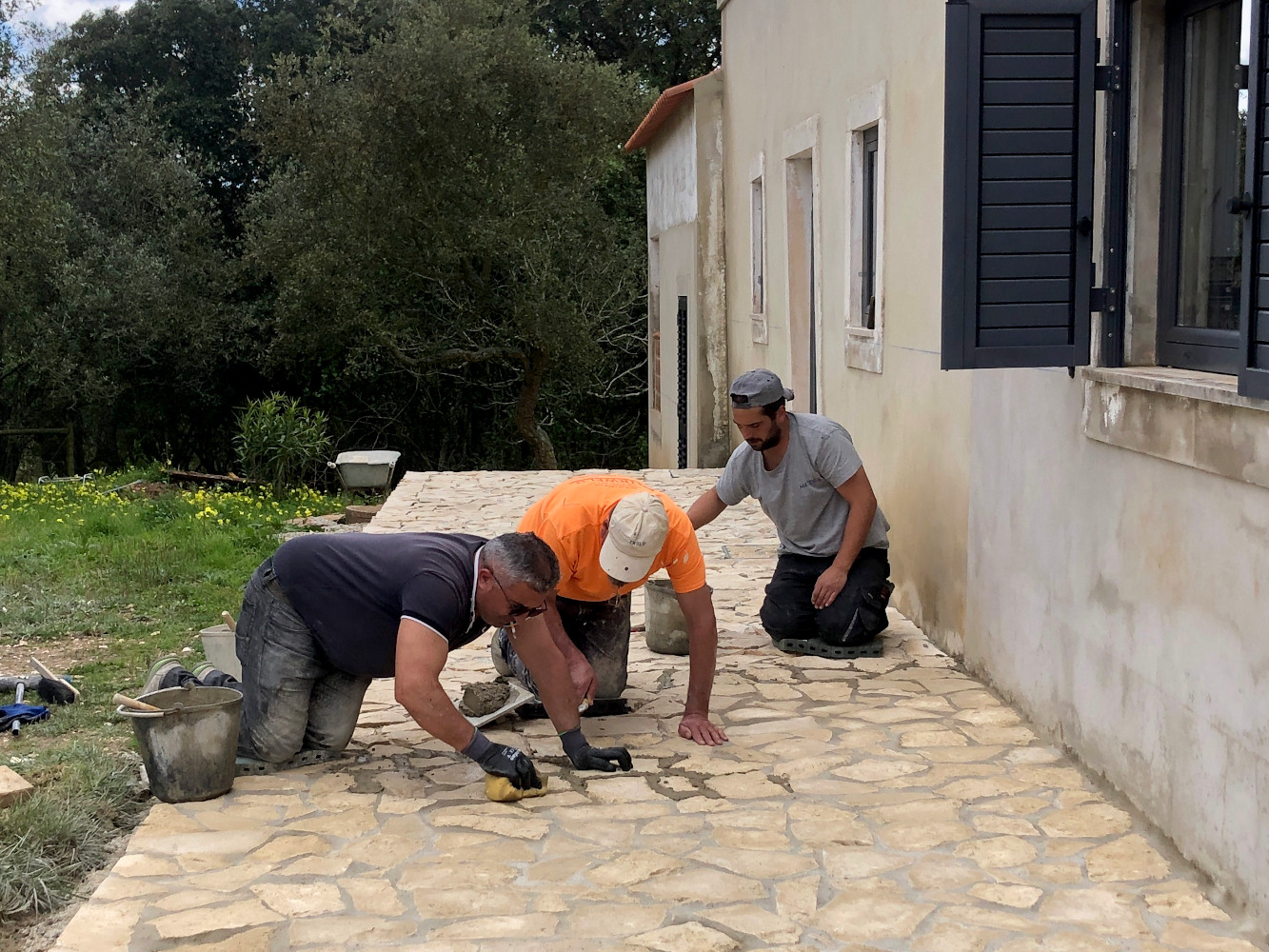 Je zou bijna zeggen dat je hier drie pelgrims ziet die op op weg zijn naar Fátima, al boetedoende op hun knieën. Het zijn de mannen die op hun knieën het terras aan het voegen zijn. Aan de taal kun je meteen horen dat het geen pelgrims zijn, in ieder geval geen godvrezende, want ze vinden het werk niet echt verschrikkelijk leuk en als ze dan te lang bezig zijn krijgen ze last van de knieën. We hebben ze wel een knielkussentje gegeven om de hobbelige stenen een beetje zachter te doen lijken, maar een lastige klus blijft het wel. Gelukkig zijn ze met zijn drieën, dan schiet het naar verhouding op en kunnen ze ondertussen ook allerhande anecdotes uitwisselen. Dat maakt het werk nog een beetje gezellig. Het is gelukkig geen maanden werk, het voegen. Ze doen met zijn drieën ongeveer vijf strekkende meter per dag, met tweeëneenhalve dag moet dat voegwerk wel achter de rug zijn.