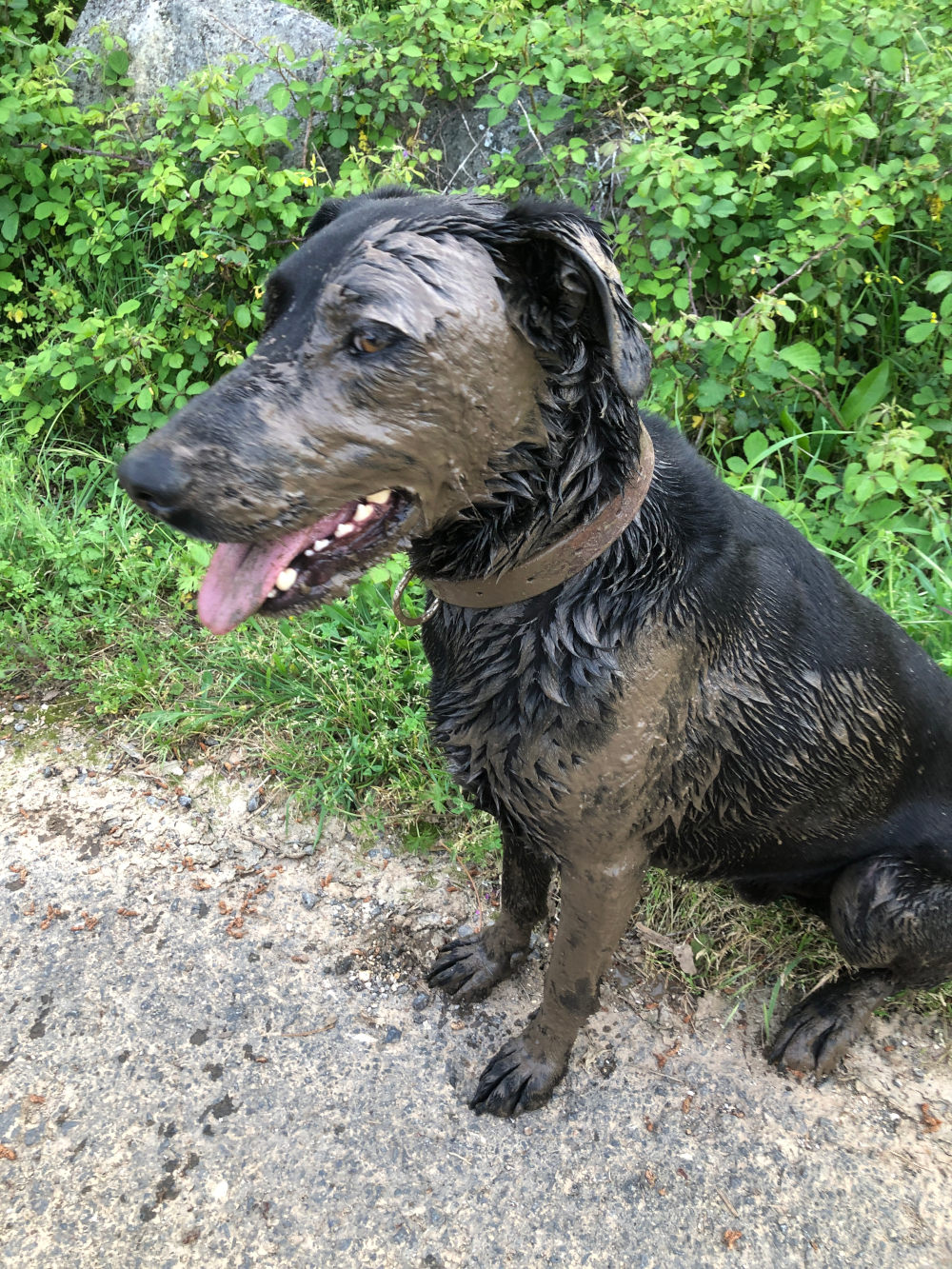 Als Tomás dan na een paar uur aan de lijn los mag, is hij door het dolle heen. Hij rent en vliegt heen en weer en, waarom weet niemand, wentelt zich door de modder langs de kant van het weggetje. Hij gaat er ondersteboven in liggen en draait net zo lang tot hij overal onder de modder zit. ’t Liefst komt hij zich dan bij je uitschudden, maar dat hebben we gelukkig weten te voorkomen.