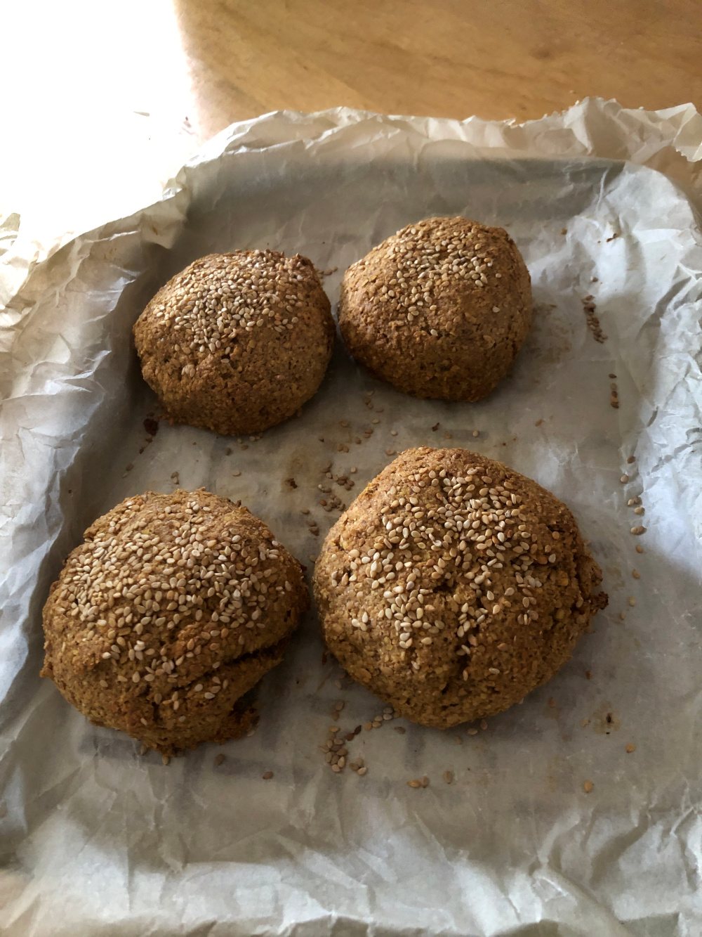 We hebben lijnzaad gemalen tot poeder en daar dan brood mee gebakken. Er zit niets anders in dan lijnzaad, water en zout. En dan nog wat sesamzaad om het er wat aantrekkelijker uit te laten zien.