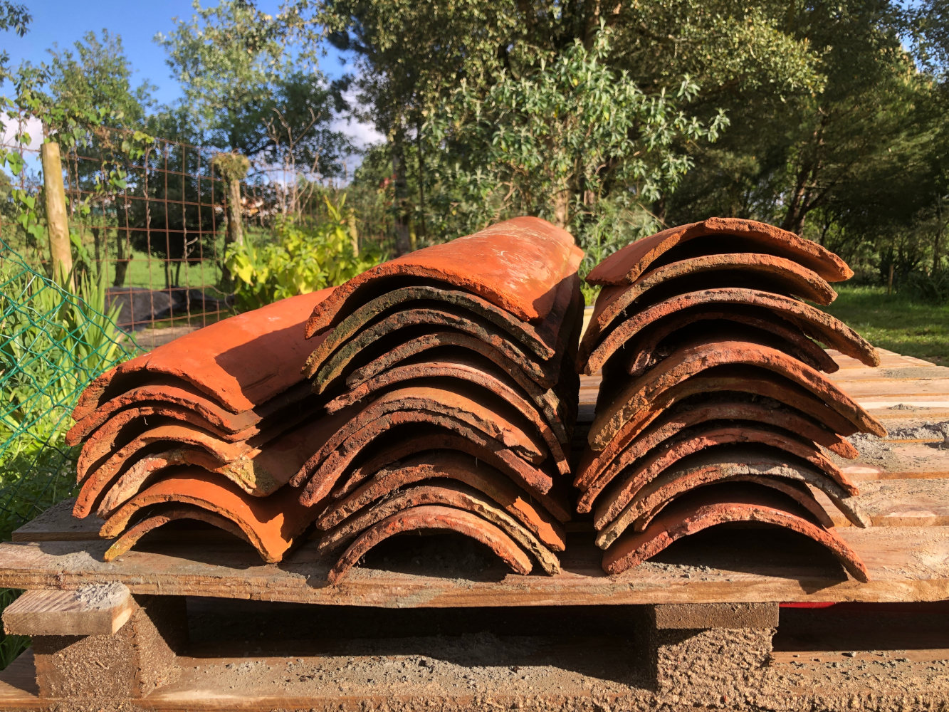 Toen de mannen het raam in de achterwand gingen maken, moest er een steiger komen. Een Portugese steiger bestaat uit twee zijkanten waar een laddertje in zit, een loopplank die die twee zijkanten verbindt en dan een kruis van twee stangen die de boel stabiel maken. Op zich niet zo moeilijk, maar je hebt twee mensen nodig die in het ding in elkaar zetten. ’t Moet een beetje met beleid en daar ontbreekt het nog wel aan bij de mannen. Het kleine uitsteeksel aan de achterkant waar een randje dakpannen opzit, zat een beetje in de weg. ’t Gevolg was dat er een paar pannen gebroken zijn. Op zich ook weer niet zo erg, maar die pannen zitten wel voor de helft in de muur ingemetseld en verder zijn het ouderwetse Portugese pannen die niet meer overal te krijgen zijn. Gelukkig zij de mannen wel zo aardig dat ze het weer gaan repareren. Ze hadden hier en daar nog wel wat van die oude pannen liggen, dus dat probleem is voorlopig ook opgelost.