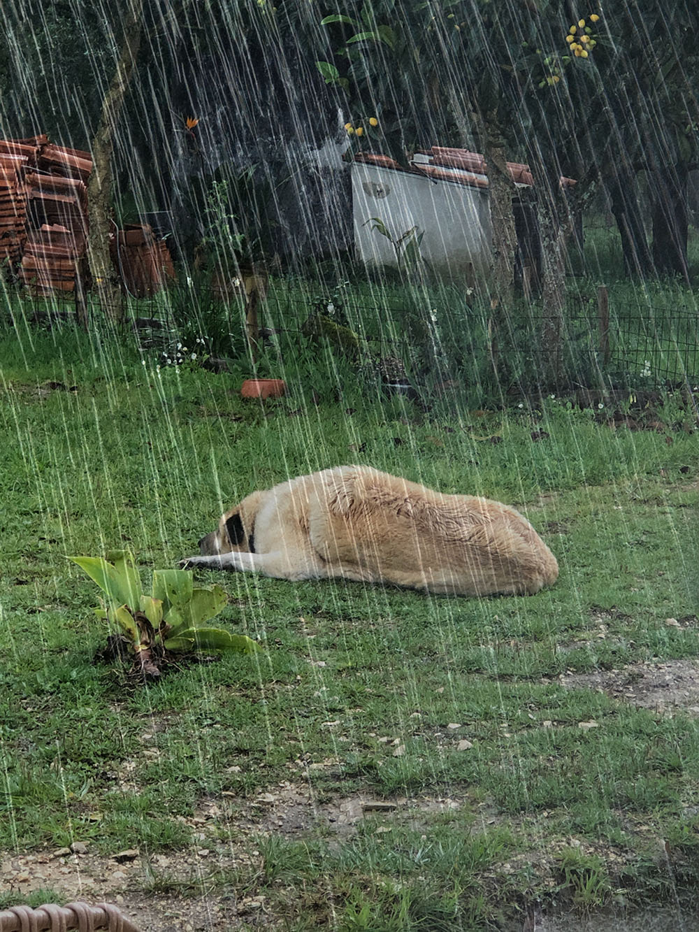 Als het regent gaan Tomás en Milan meteen naar boven. Die houden niet van nat worden. Hun vacht is heel anders dan die van Karma. Ze worden echt nat en daardoor krijgen ze het koud. Boven kunnen ze rustig en droog liggen. Wachten tot de bui over is. Karma vindt het allemaal prima. Die ligt in de stromende regen gewoon buiten. Af en toe staat ze op, schudt eens flink alle druppels van zich af en gaat dan weer doodgemoedereerd liggen. Ondanks de regen wordt ze eigenlijk niet nat. Al het water blijft aan de buitenkant van haar vacht hangen. Koud krijgen doet ze het daarom ook niet gauw. Alleen als het hagelt, dan wordt ze wel een beetje knorrig en gaat ook naar binnen en dat hebben we al weer een paar keer gehad, de afgelopen uren.