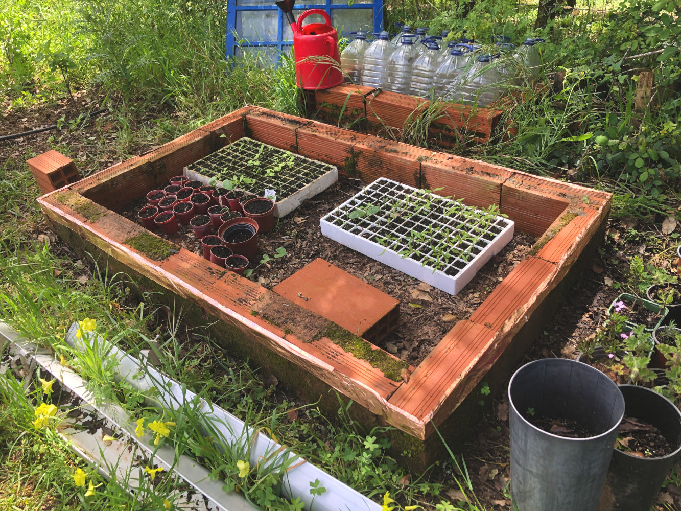 In de moestuin hebben we een soort van koude kas gemaakt. Hier staan de plantjes in hun allereerste begin te groeien. Een soort couveuse eigenlijk. ’s Nachts gaan de deksels erop, dit om de slakken een beetje tegen te houden. Helaas helpt dat niet altijd. Soms vergeten we ze ’s avonds dicht te doen en soms hebben de slakken toch nog een doorgang gevonden. Dan maar wat anders bedenken. Slakken houden niet van koper en bij de Lidl is er nu in het schap van ‘goodies’ koperband te koop.