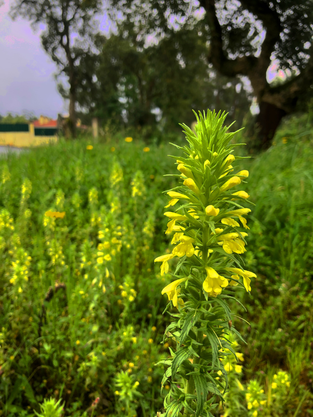 Nou dat probleem is ook weer opgelost. Een opname iets meer erbovenop geeft uitsluitsel. De mysterieuze plant blijkt Parentucellia Viscosa te zijn. In goed Nederlands Kleverige Ogentroost. In het Portugees geen spectaculaire naam, Erva peganhanta, wat kleverig kruid betekent. Het is een mooie plant die niet elk jaar terugkomt, dus we hebben geluk dit jaar dat het overal opkomt.
