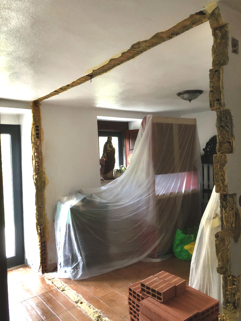 Onze slaapkamer is nogal aan verandering onderhevig! We slapen tijdelijk in de woonkeuken. De slaapkamer is omgeturnd tot opslagruimte, het staat vol met spullen uit de andere kamer. De muur tussen het gangetje en de slaapkamer is weggebroken. Hierdoor ontstaat een grotere ruimte en nog mooier, openslaande deuren in de slaapkamer. Het plan is dat we hier straks weer een slaapkamer van maken, tijdelijk dan, want uiteindelijk wordt de zolder onze slaapkamer. Hiervoor moesten we wachten op het gat, en nu het gat er is moeten we wachten op de trap. De timmerman hebben we al gesproken, dat geeft goede hoop. Ondertussen wordt er hard gewerkt aan de voorzolder.