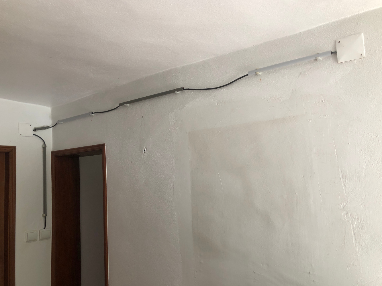 Als er wanden worden weggebroken verdwijnen er stopcontacten en schakelaars. We willen wel licht hebben in de ontstane kamer. Pas in oktober wordt de boel beneden definitief aangepakt. Dan worden er nieuwe deuren geplaatst om de kleine deuren die er nu zijn te vervangen. De vloer wordt vervangen en alle muren worden opnieuw gestuct. We gaan nu niet de elektriciteit in de muren frezen, dat doen we tegen die tijd wel als toch alles open ligt en het huis tijdelijk onbewoonbaar is. Dus nu maar provisorisch wat leidingen leggen en nutteloze schakelaars weer nuttig maken. We gebruiken wat er al in de muur of het plafond zit en de rest doen we gemakshalve buitenom.