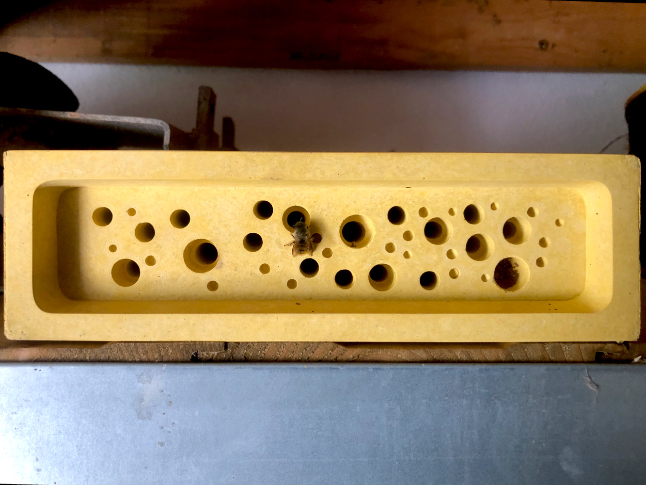 Een tijdje geleden al hebben we een prachtige steen gehad. Een metselbijsteen. Bedoeld om metselbijtjes een beetje te helpen bij het vinden van een geschikte locatie. Wat ze doen is een klein gaatje in de muur vinden, daar naar binnen kruipen, eitjes leggen en de boel dichtmetselen opdat niemand erbij kan. In het Oude Huis zitten ze ook overal, maar doordat Leo de boel aan het dichtvoegen is, blijven er weinig gaatjes voor ze over. Zo’n steen als deze helpt daarbij. Ze hebben de maat van een gewone baksteen, waardoor je ze in de muur zou kunnen inmetselen. Deze staat gewoon los op een plank en daar vinden ze hun weg ook wel. Eén gaatje rechts is al dicht en de volgende is in de maak.