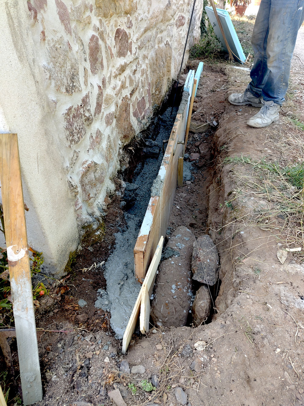 Dan maar op die plekken een fundering maken, opdat het Oude Huis niet meer op klei staat, maar daadwerkelijk op de rotsen. We hebben het geluk dat Leo heeft aangeboden een week lang te komen werken. Hij heeft vakantie, zijn bedrijf is een paar weken dicht. De boel wordt uitgegraven tot op de rotsen. Onder de muur worden gaten gemaakt waar betonnen balken in gaan. Vervolgens wordt de geul volgestort met cement en betonijzer. Een hele klus, maar Leo werkt goed door ondanks de warmte. Als wij het uitpuffen, is hij lekker zingend bezig. Wat een mazzel hebben wij.