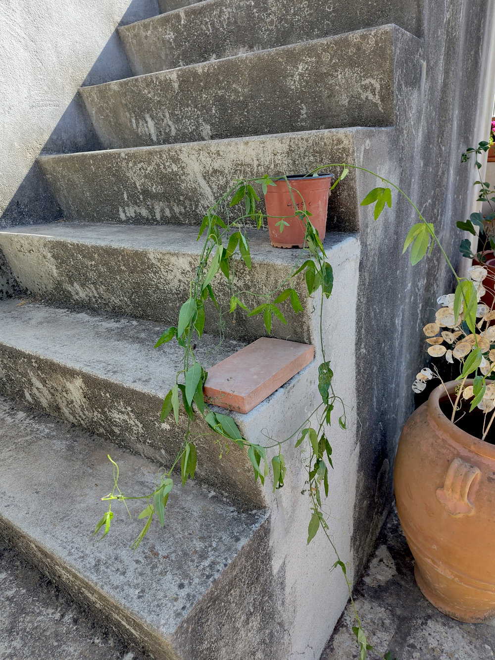 De volgende dag stond er een maracuja op het trappetje bij het huis. Had hij neergezet, als een soort kadootje, omdat we hadden gezegd dat we een stek bij hem zouden komen stelen. Bij zijn bedrijf heeft hij in het hek een heel grote bananenmaracuja staan en hij juichte het toe als we daar stekken van zouden nemen.