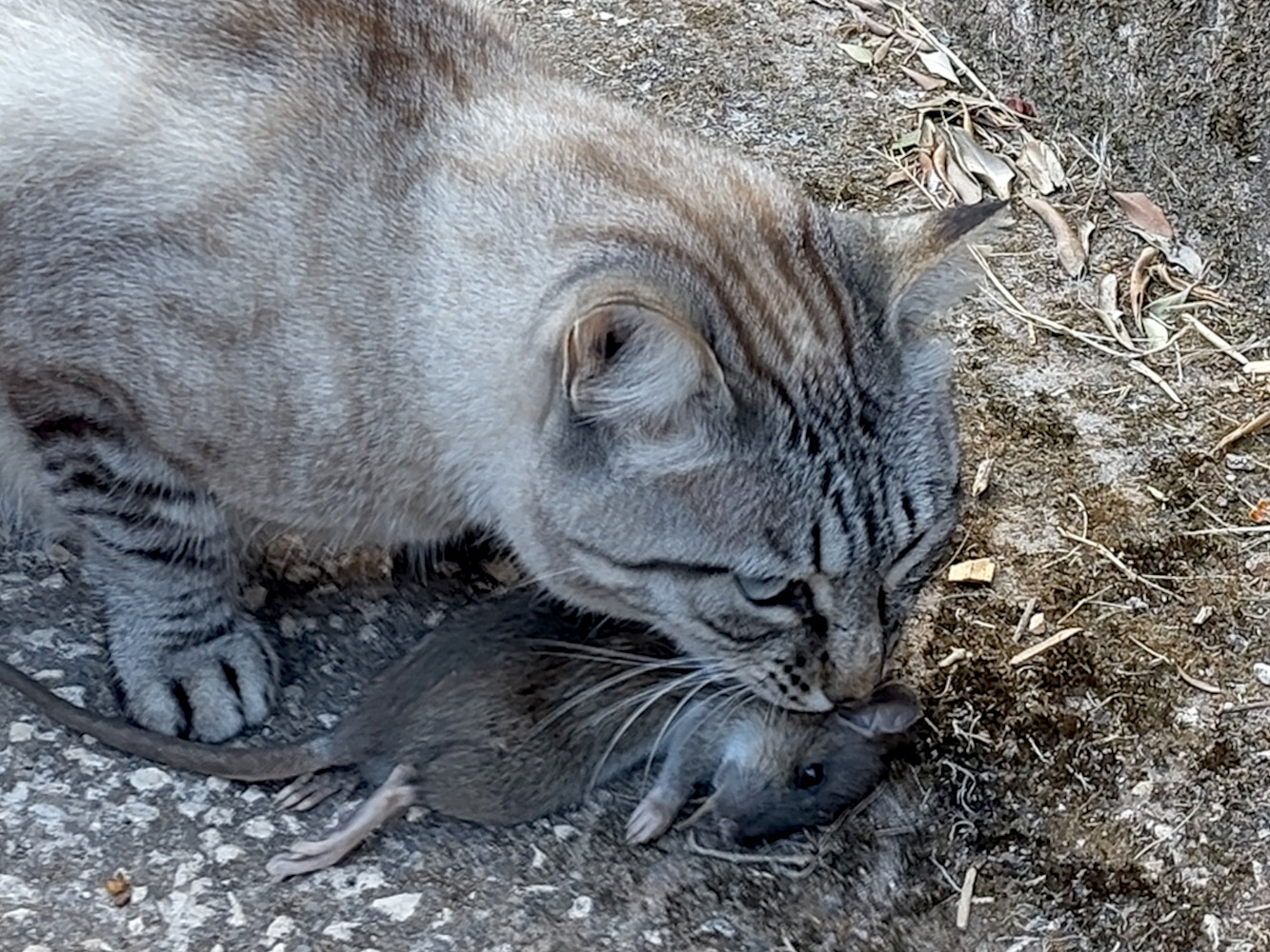 Elke kat komt weleens thuis met een vangst. Vaak wordt dat aan ons aangeboden en Légolas komt het ook wel eens brengen en laat Floki dan de buit verschalken. Deze keer niet Légolas had een flinke rat gevangen en was absoluut niet van plan deze te delen. Zelfs naar ons, als we in de buurt kwamen, begon hij te grommen, uiteindelijk sleepte hij de rat onder de watertanks waar niemand erbij kon en met de rug naar ons toe at hij het dier met huid en haar op. Een paar minuten later kwam hij likkebaardend naar binnen om water te drinken.